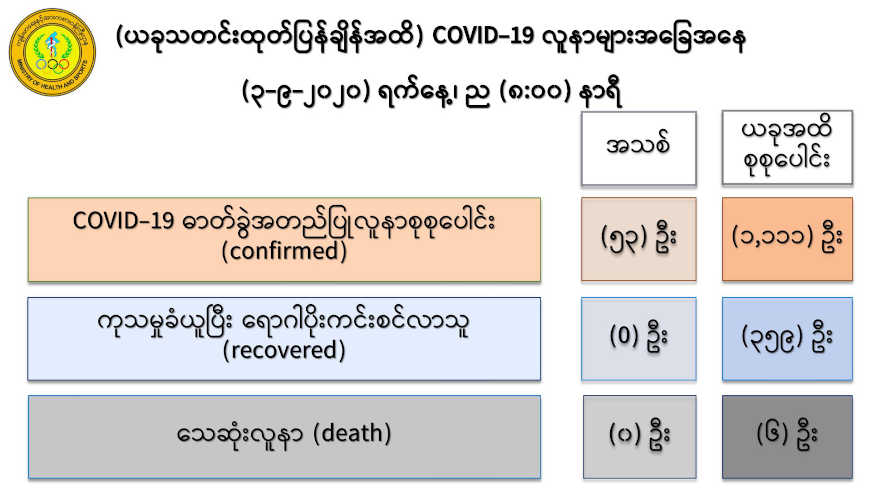 ပြီးခဲ့သည့် သြဂုတ်လ ၁၆ ရက်နေ့မတိုင်မီက Covid 19 ပိုးတွေ့လူနာ ၃၇၄ ဦးသာရှိခဲ့ရာမှ ယနေ့ စက်တင်ဘာ ၃ ရက် ည ၈ နာရီအထိ မြန်မာနိုင်ငံတွင် COVID-19 ရောဂါဓာတ်ခွဲ အတည်ပြုလူနာ (၁,၁၁၁) ဦးရှိပြီး ရန်ကုန်တိုင်းဒေသကြီးနှင့် ရခိုင်ပြည်နယ်တို့မှ အများဆုံးတွေ့ရှိထားသည်။