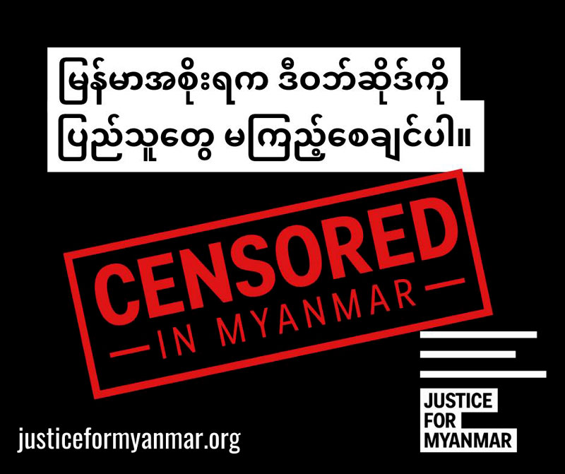 ထို့အပြင် မြန်မာအစိုးရသည် ရခိုင်နှင့် ကရင်ဒေသများတွင် လူ့အခွင့်အရေးချိုးဖောက်မှုများကို ရေးသားနေသည့် Karen Information Center ၊ Development Media Group နှင့် Narinjara သတင်းဌာနများအပါအဝင် တိုင်းရင်းသားသတင်းမီဒီယာ ဝဘ်ဆိုဒ်များအား ပိတ်ခဲ့ပြီးနောက် Justice For Myanmar ကို ဆင်ဆာပိတ်ပင်မှု လုပ်ဆောင်လာခဲ့ခြင်းဖြစ်ကြောင်း ထုတ်ပြန်ချက်က ဆိုသည်။
