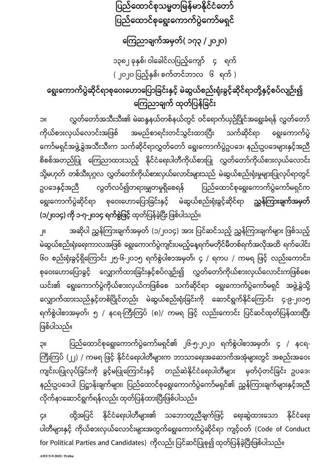 ထို့ပြင် ပြည်ထောင်စု ရွေးကောက်ပွဲကော်မရှင်၏ ၂၀၂၀ ခုနှစ် မေ ၂၆ ရက် ရက်စွဲဖြင့် ထုတ်ပြန်ချက်အရ နိုင်ငံရေးပါတီများနှင့် ကိုယ်စားလှယ်လောင်းများအား ဘာသာရေးအဆောက်အအုံများတွင် အစည်းအဝေးကျင်းပပြုလုပ်ခြင်းကို တားမြစ်ထားပြီး တည်ဆဲနိုင်ငံရေးပါတီများ၏ မှတ်ပုံတင်ခြင်းဥပဒေ၊ နည်းဥပဒေပါ ပြဌာန်းချက်များ ပြည်ထောင်စု ရွေးကောက်ပွဲကော်မရှင်၏ ညွှန်ကြားချက်များနှင့်အညီ လိုက်နာဆောင်ရွက်ရန်လည်းလိုကြောင်း UEC ၏ ထုတ်ပြန်ချက်ထဲတွင် ဖော်ပြထားသည်။