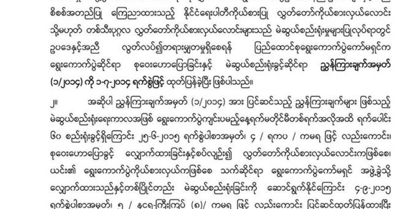 ထို့အပြင် အထွေထွေရွေးကောက်ပွဲနှင့်စပ်လျဉ်း၍ ထုတ်ပြန်မည့် ကိုဗစ်ဗိုင်းရပ်စ် ကာကွယ်ထိန်းချုပ်ရေးဆိုင်ရာ ကျန်းမာရေးစံလုပ်ငန်းလမ်းညွှန် (Standard Operating Procedure – SOP) နှင့် သက်ဆိုင်ရာက အချိန်ကာလ/နေရာဒေသအလိုက် ထုတ်ပြန်သည့် ကျန်းမာရေးဆိုင်ရာအမိန့်များ လမ်းညွှန်ချက်များလည်း လိုက်နာရမည်ဖြစ်သည်ဟု ဆိုသည်။