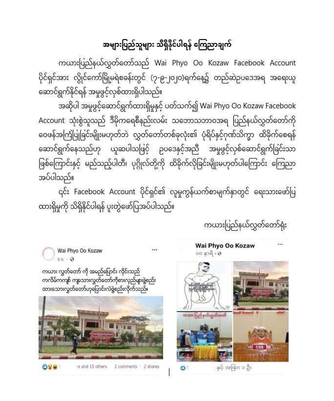 စိုးထိုက်အောင် — ဖေ့စ်ဘွတ်လူမှုကွက်ယက် စာမျက်နှာမှာ ကယားပြည်နယ်လွှတ်တော်ရဲ့ ပုံရိပ်နဲ့ ဂုဏ်သိက္ခာ ထိခိုက်စေတဲ့ စာအရေးအသား ရေးသားသူကို ကယားပြည်နယ်လွှတ်တော်ကနေ စက်တင်ဘာ ၇ ရက်နေ့ လွိုင်ကော်မြို့မ ရဲစခန်းမှာ ဆက်သွယ်ရေးဥပဒေပုဒ်မ ၆၆ ဃ နဲ့ အမှုဖွင့်ခဲ့ပါတယ်။