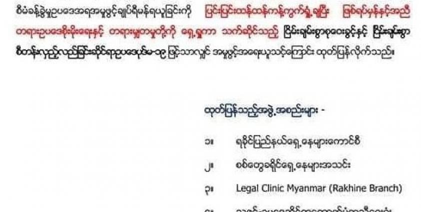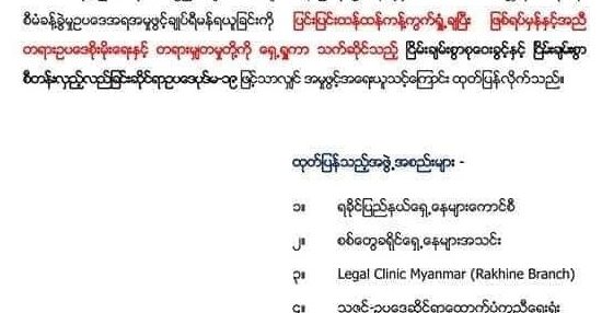 ကြေညာချက်ထုတ်ကြသည့် ရှေ့နေအဖွဲ့ (၄) ဖွဲ့မှာ ရခိုင်ပြည်နယ်ရှေ့နေများကောင်စီ၊ စစ်တွေ ခရိုင် ရှေ့နေများအသင်း၊ Legal Clinic Myanmar ( Rakhine Branch) နှင့် သဇင်ဥပဒေဆိုင်ရာ ထောက်ပံ့ ကူညီရေးအဖွဲ့တို့ဖြစ်ကြသည်။