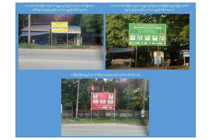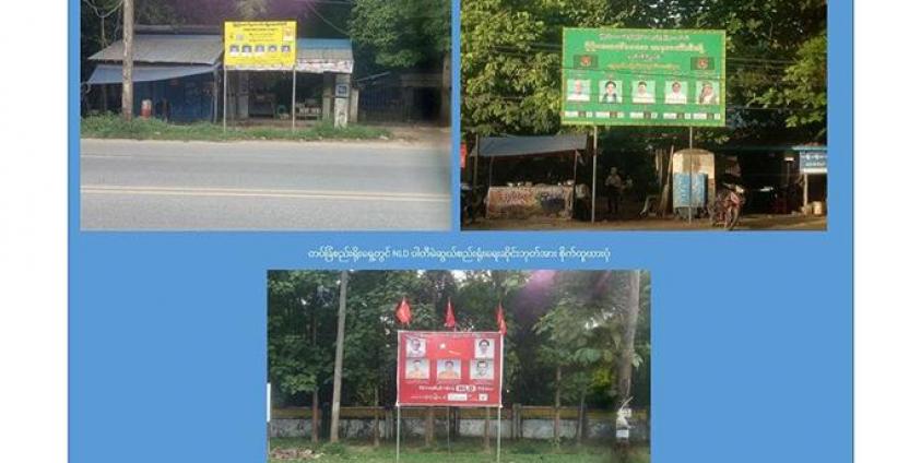 စက်တင်ဘာလ ၁၅ ရက်နှင့် ၁၆ ရက်များတွင် ပြည်ထောင်စု ကောင်းကျိုးဆောင်ပါတီနှင့် ပြည်ထောင်စု ကြံ့ခိုင်ရေးနှင့် ဖွံ့ဖြိုးရေးပါတီတို့က ကားလမ်း၏ တစ်ဖက်ခြမ်းသို့ ပြောင်းရွှေ့စိုက်ထူသွားပြီး အမျိုးသားဒီမိုကရေစီ အဖွဲ့ချုပ်ပါတီ ဆိုင်းဘုတ်မှာ ဆက်လက် စိုက်ထူးထားသည့်အတွက် မြို့နယ်၊ ခရိုင် ရွေးကောက်ပွဲ ကော်မရှင် အဆင့်ဆင့်ကို ထပ်မံ အသိပေးသွားမည်ဖြစ်ကြောင်း တပ်မတော် သတင်းမှန်ပြန်ကြားရေးအဖွဲ့က ထုတ်ပြန်ထား သည်။