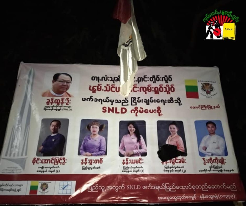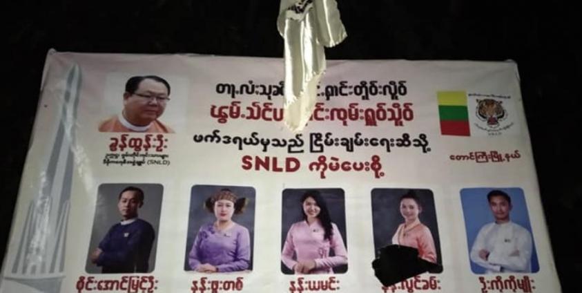 တောင်ကြီးမြို့နယ်တွင်း ဝင်ရောက်ယှဉ်ပြိုင်မည့် ရှမ်းတိုင်းရင်းသားများ ဒီမိုကရေစီအဖွဲ့ချုပ် (SNLD) ပါတီ၏ ကိုယ်စားလှယ်လောင်း ၅ ဦး၏ ဆိုင်းဘုတ်တည်ထောင်ထားရာ ကိုယ်စားလှယ်လောင်း တစ်ဦး၏ ပုံရိပ်ကို ခဲဖြင့်ပေါက်ထားကြောင်း သိရသည်။