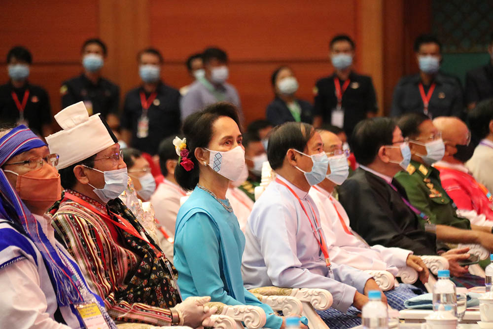 အပြည်ပြည်ဆိုင်ရာကွန်ဗင်းရှင်းဗဟို ခန်းမ-၂ ပတ္တမြားခန်းမကြီးကတော့ အနီရောင်ရဲရဲထိုင်ခုံတွေ လွှမ်းမိုးထားပါတယ်။ ခန်းမအတွင်းကို ဝင်လာသူတွေထဲမှာ အရောင်အသွေးမျိုးစုံ၊ ရှမ်း၊ ချင်း၊ ကရင်၊ မွန်၊ ရခိုင် လားဟူ၊ ဗမာ၊ ကချင်စတဲ့ တိုင်းရင်းသားရိုးရာဝတ်စုံတွေရော၊ စစ်ဝတ်စုံတွေရော ရောပြွန်းနေပါတော့တယ်။