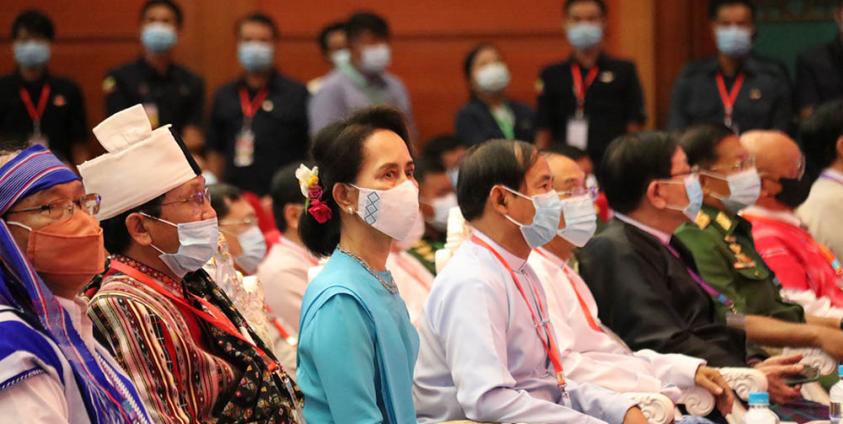ညီလာခံခန်းမရဲ့ ရှေ့ဆုံးတန်းမှာတော့ အမျိုးသမီးအနေနဲ့ နိုင်ငံတော်အတိုင်ပင်ခံ ဒေါ်အောင်ဆန်းစုကြည် နေရာယူထားပြီး ကျန်အမျိုးသမီးတွေကလည်း သတ်မှတ်ထားတဲ့နေရာမှာ ကြိုကြားကြိုကြား ကိုယ်စီနေရာယူနေကြတာ မြင်တွေ့နေရပါတယ်။
