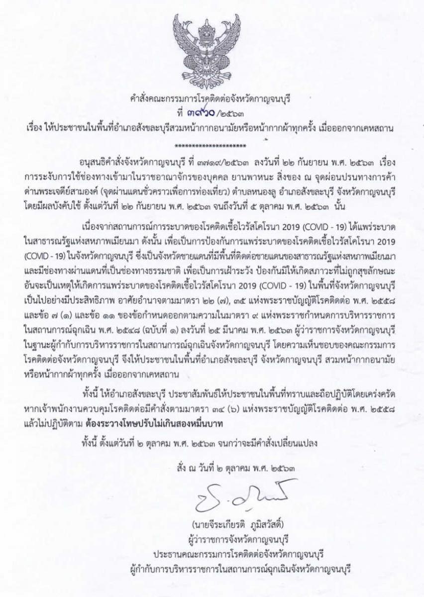 ထိုင်းနိုင်ငံ ကန်ချနပူရီပြည်နယ် စံခလပူရီခရိုင် Sangkhlaburi District နေအိမ်ပြင်ပထွက်သူတိုင်း Mask မဖြစ်မနေတပ်ထားရန်နှင့် ပျက်ကွက်ပါက ဘတ် ၂ သောင်းထက်မပိုသော ဒဏ်ငွေပေးဆောင်ရမည်ဖြစ်ကြောင်း အောက်တိုဘာ ၂ ရက်နေ့ အမိန့်ထုတ်ပြန်လိုက်သည်။