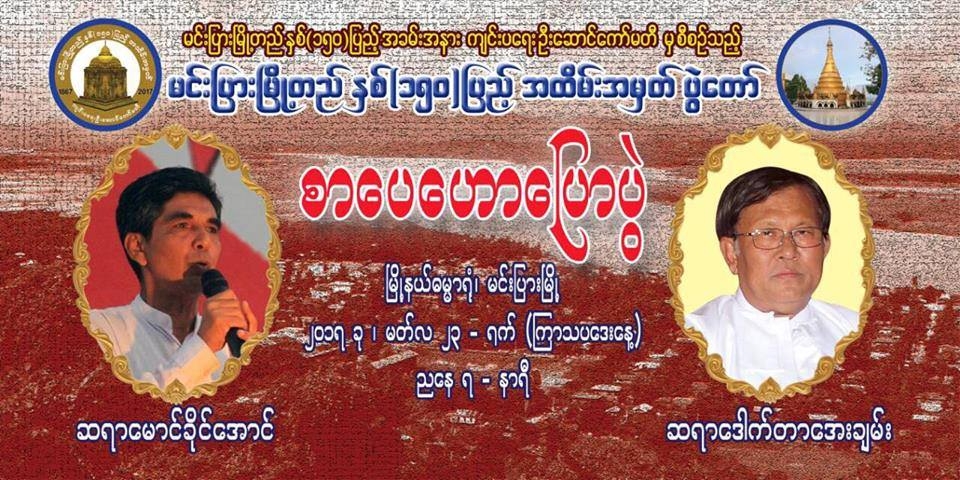 စာပေဟောပြောပွဲကို မတ်လ ၂၃ ရက် ကြာသပဒေးနေ့ ညနေ ရ-နာရီ အချိန်တွင် မင်းပြားမြို့၊ မြို့နယ်ဓမ္မာရုံတွင် ကျင်းပပြုလုပ်မည်ဖြစ်ကြောင်း သိရသည်။
