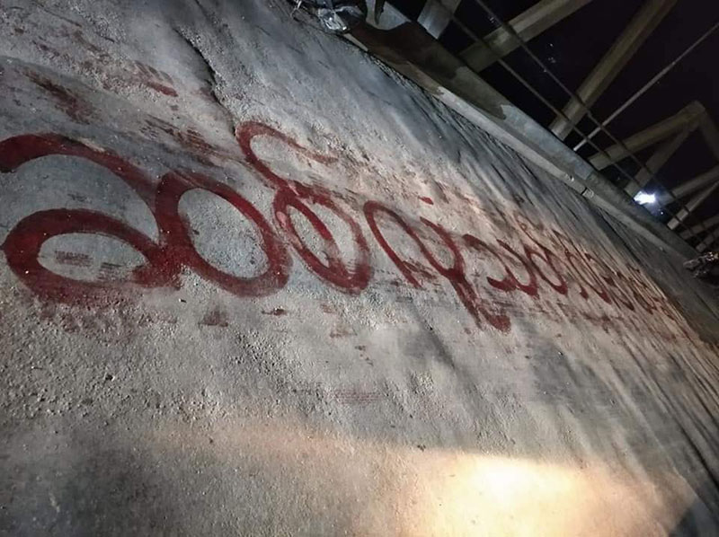 တောင်ကုတ်မြို့ ကိုင်းရှည်တံတားပေါ်တွင် ရေးသားထားသောစာများအား တွေ့ရစဉ်။ ဓာတ်ပုံ - facebook)