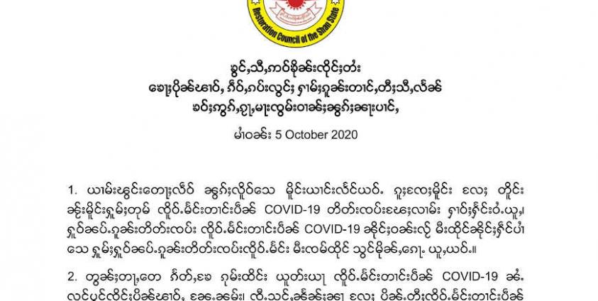 RCSS/SSA ၏ ကြေညာချက်တွင်- ယနေ့မြန်မာနိုင်ငံတွင် ကိုဗစ်ကူးစက်အတည်ပြုလူနာ တရက်လျှင် ၁၀၀၀ ကျော်တိုးများလာနေကြောင်း၊ ကိုဗစ်ကူးစက်မှုလျှော့ချနိုင်ရေးအတွက် ဒေသခံလူထု နေအိမ်တွင်သာနေစေလိုကြောင်း၊ RCSS/SSA အနေဖြင့်လည်း ဌာနချုပ်မှစပြီး အဆင့်ဆင့် ကိုဗစ်ကာကွယ်ရေးကော်မတီဖွဲ့စည်းထားကြောင်း၊ လူထုကျန်းမာရေးအတွက် မိမိထိန်ချုပ်ဒေသရှိကျေးရွာများအတွင်းသို့ ရွာပြင်ပမှလူများ အောက်တိုဘာလ ၅ ရက်မှ ၃၁ ရက်နေ့အထိ ၀င်ခွင့်မပြုကြောင်း၊ မဲဆွယ်စည်းရုံးရေးဆင်းမည့်ပါတီများအနေဖြင့် ကျန်းမာရေးဌာနထုတ်ပြန်ချက်အတိုင်း တိတိကျကျလိုက်နာရန်နှင့် ကိုဗစ်ကူးစက်မှုထိန်းချုပ်နိုင်ရေးအတွက် RCSS/SSA အနေဖြင့် အစိုးရ ၊တပ်မတော်နှင့်အတခြားအဖွဲ့အစည်းများနှင့်လက်တွဲပူးပေါင်းဆောင်ရွက်သွားမည်- အစရှိသည့်အချက်များပါရှိပါသည်။
