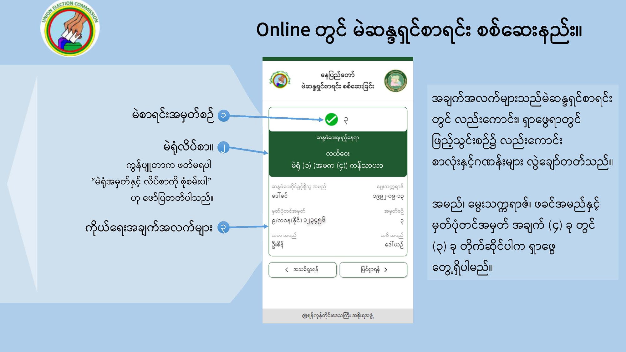 မဲဆန္ဒရှင်စာရင်းများကို အောက်တိုဘာ ၁ ရက်မှစတင်၍ အွန်လိုင်းမှတဆင့် ကြည့်ရှုစစ်ဆေးနိုင်ပြီဖြစ်သည်။
