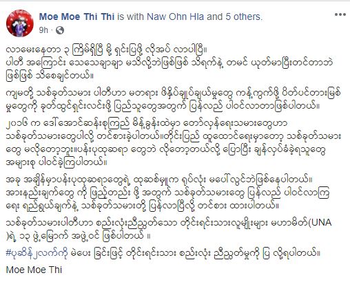 ဒီလိုသတင်းပုံစံသက်ရောက်တဲ့ စကားစုဟာ မဟုတ်မှန်တဲ့အကြောင်းကို UNDP ပါတီမှ ရန်ကုန်တိုင်း ဆိပ်ကြီး/ခနောင်တိုမြို့နယ်မှ ပြည်သူ့လွှတ်တော် ကိုယ်စားလှယ်လောင်းအဖြစ် ဝင်ရောက်ယှဉ်ပြိုင်မယ့် ဒေါက်တာဒေါ်မိုးမိုးသီက သူ့ရဲ့ Facebook လူမှု့ကွန်ရက် အကောင့်ဖြစ်တဲ့ Moe Moe Thi Thi အကောင့်ကနေ အခုလိုမျိုး ပြန်ရှင်းထားပါတယ်။