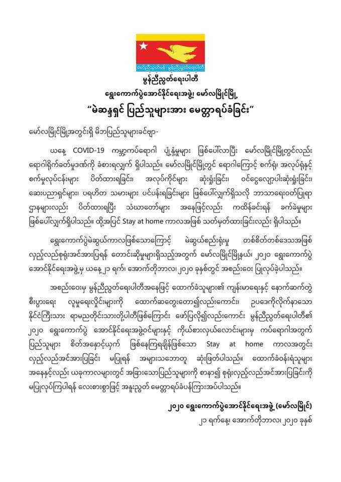 ဗညားပိုင်  - COVID 19 ရောဂါပျံ့နှံ့မှုများနေသောကြောင့် မော်လမြိုင်မြို့ပေါ်၌ မွန်ညီညွတ်ရေးပါတီထောက်ခံသူများအနေဖြင့် မဲဆွယ်စည်းရုံးမှုလှည့်လည်အင်အားပြခြင်း မပြုလုပ်ကြပါရန် အောက်တိုဘာလ ၂၁ ရက်နေ့က မော်လမြိုင်မြို့ မွန်ညီညွတ်ရေးပါတီ MUP ရွေးကောက်ပွဲအောင်နိုင်ရေးအဖွဲ့က မေတ္တာရပ်ခံချက်တစ်စောင် ထုတ်ပြန်လိုက်သည်။