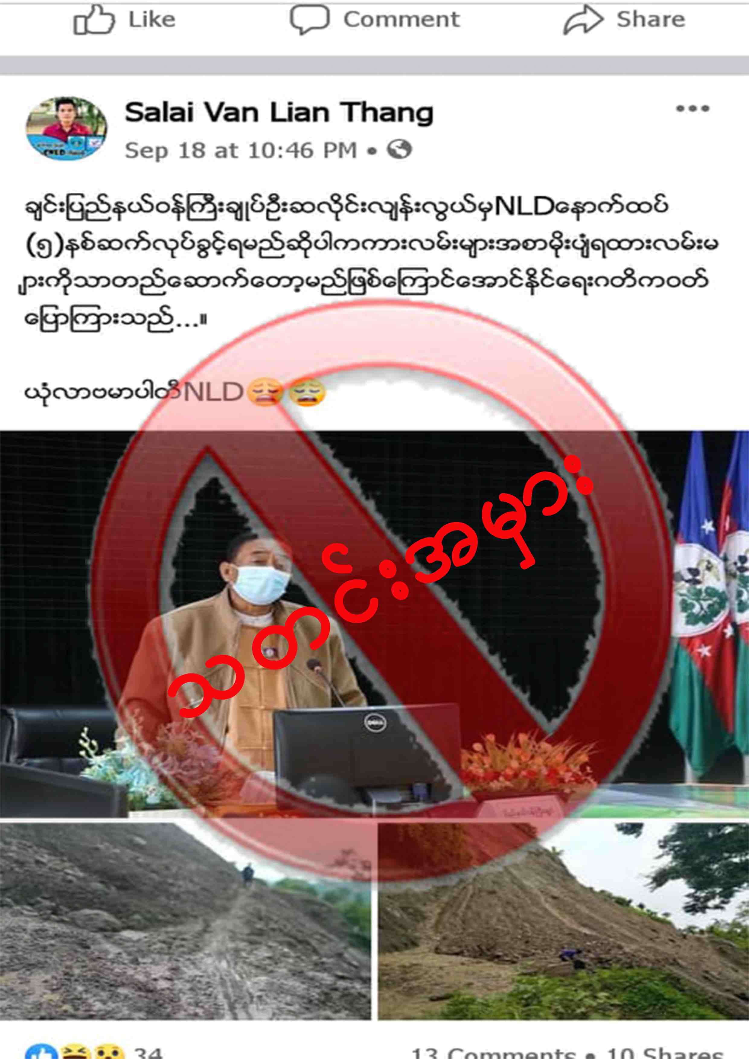 ရွေးကောက်ပွဲနီးလာတာနဲ့အမျှ ဆိုရှယ်မီဒီယာပေါ်မှာပြန့်နေတဲ့ သတင်းအမှားတစ်ပုဒ်ကတော့ NLD ပါတီနောက်ထပ် (၅) နှစ် အစိုးရဆက်လုပ်ခွင့်ရမည်ဆိုပါက ကားလမ်းများအစား မိုးပျံရထားလမ်းများကိုသာ တည်ဆောက်တော့မယ်လို့ ချင်းပြည်နယ်ဝန်ကြီးချုပ် ဆလိုင်းလျန်လွယ်က ရွေးကောက်ပွဲအောင်နိုင်ရေးဂတိကဝတ်ပြုခဲ့တယ်ဆိုတဲ့ သတင်းအမှားပဲဖြစ်ပါတယ်။