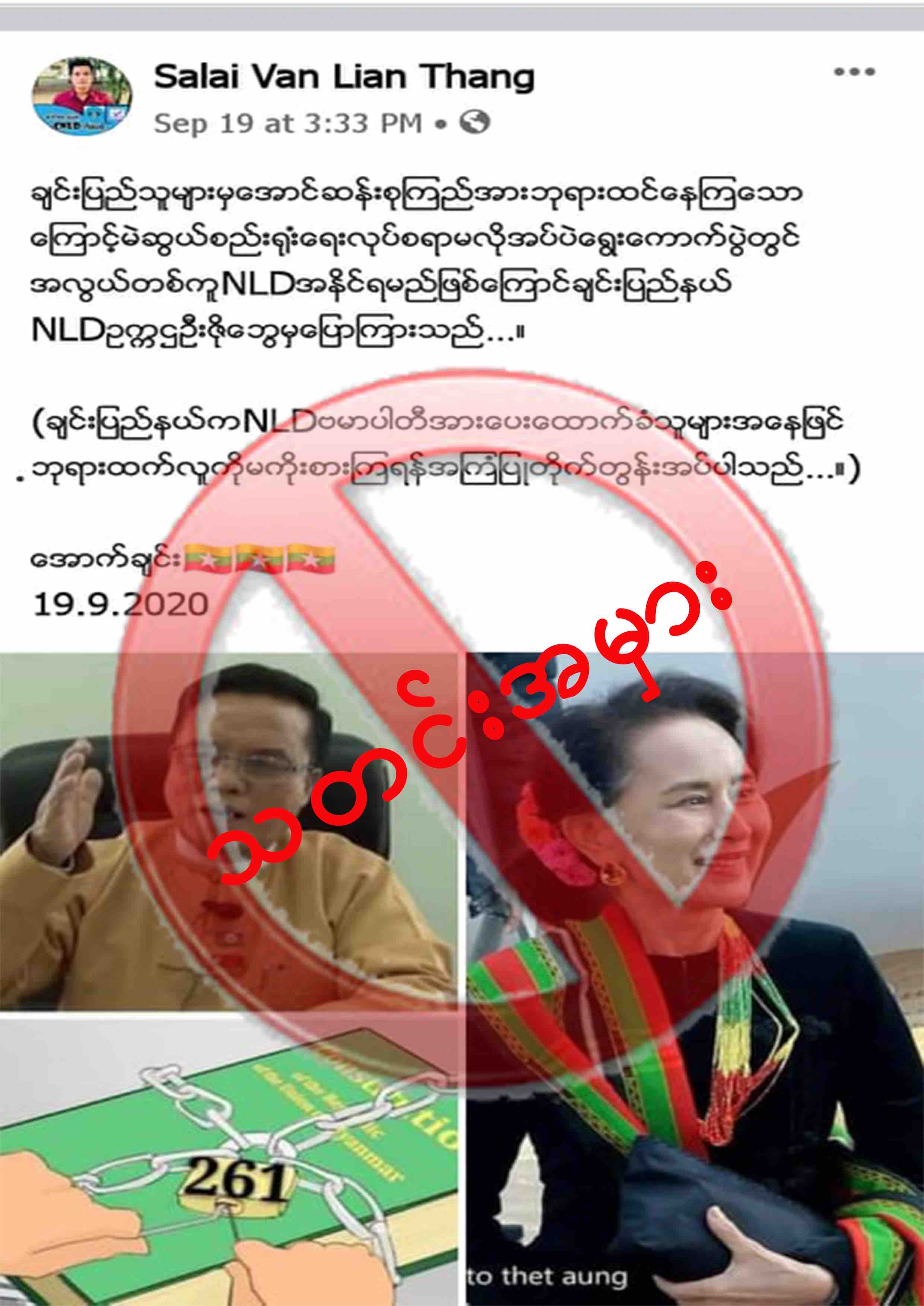 ချင်းပြည်သူတွေအနေနဲ့ အောင်ဆန်းစုကြည်အား ဘုရားထင်နေကြသောကြောင့် မဲဆွယ်စည်းရုံးရေးလုပ်စရာမလိုအပ်ပဲ ရွေးကောက်ပွဲမှာအလွယ်တကူ NLD အနိုင်ရမယ်ဆိုပြီး ချင်းပြည်နယ် NLD ဥက္ကဌဦးဇိုဘွေ့က ပြောကြားဆိုတဲ့ သတင်းအမှားတစ်ပုဒ်ဟာ လူမှုကွန်ယက်စာမျက်နှာပေါ်မှာ ပြန့်နှံ့နေပါတယ်။