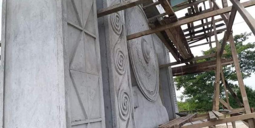 အဆိုပါ မြို့အဝင်ဆိုင်းဘုတ်ကို ၂၀၂၀ ပြည်နှစ် အောက်တိုဘာ ၁၀ ရက်က တည်ဆောက်ခဲ့ခြင်းဖြစ်ပြီး ကချင်တိုင်းရင်းသားအမှတ်အသားကို ထည့်သွင်းတည်ဆောက်မှုအပေါ် ပါတီတစ်ခုနှင့် ဒေသခံလူနည်းစုတိုင်းရင်းသားများက ကန့်ကွက်မှုများပြုလုပ်ထားကြောင်း သိရသည်။