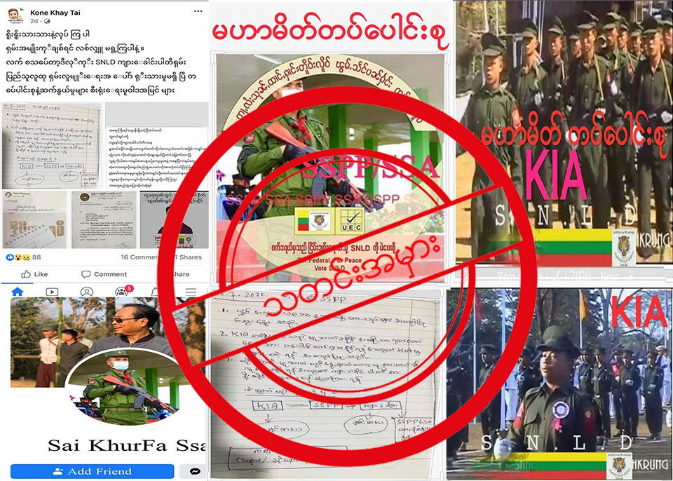 ရှမ်းတိုင်းရင်းသားများဒီမိုကရေစီအဖွဲ့ချုပ် SNLD ပါတီက ရှမ်ပြည်နယ်မြောက်ပိုင်းမှာ မြောက်ပိုင်းမဟာမိတ်အဖွဲ့ဝင်တွေဖြစ်တဲ့ KIA၊ SSPP တို့ရဲ့အကူအညီနဲ့ မဲဆွယ်စည်းရုံးရေးလုပ်ငန်းများကို လုပ်ဆောင်ခဲ့တယ်ဆိုတဲ့ သတင်းအမှားကို Kone Khay Tai ဆိုတဲ့ အကောင့်ကနေ နိုဝင်ဘာလ ၁၁ ရက် နေ့လည် ၂ နာရီ ၃၃ မိ နစ်က တင်ခဲ့တဲ့ပုံတွေထဲမှာ တွေ့ရပါတယ်။