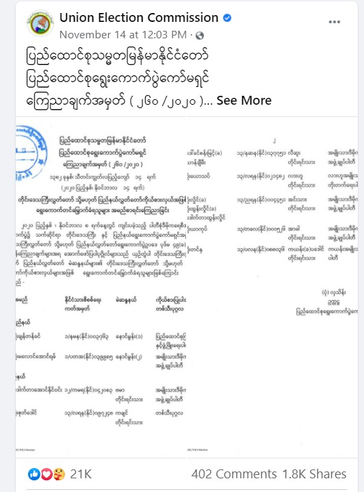 အဆိုပါ သတင်းအချက်အလက်မှာ ရွေးကောက်ပွဲအပြီး UEC မှပြန်လည်ထုတ်ပြန်သည့် နောက်ပိုင်းမှ သတင်း အမှားပုံစံဖြစ်သွားပြီး ပထမဆုံး သတင်းအရင်းအမြစ်မှာ ရှမ်းပြည်နယ်တွင် ဒူးလေးပါတီဖြင့် လီဆူရေးရာဝန်ကြီးအဖြစ် ဝင်ရောက်ယှဉ်ပြိုင်သည့် ကိုယ်စားလှယ်လောင်းကိုယ်တိုင် အကြောင်းပြန်လာသည့်အပေါ်မှာ အတည်တကျယူပြီး လူမှုကွန်ယက်မှာ ပြန့်သွားရခြင်းဖြစ်သည်ဟု သူကဆက်ဆိုခဲ့သည်။