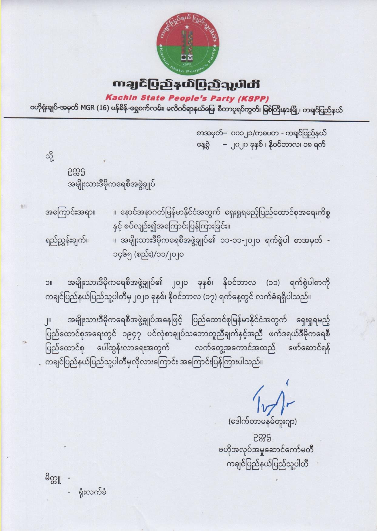 အမျိုးသားဒီမိုကရေစီအဖွဲ့ချုပ်က နိုဝင်ဘာ ၁၁ ရက်နေ့စွဲဖြင့်ပေးပို့လာသည့် သဘောထားကြေညာချက်ပါသည့်စာအား ကချင်ပြည်နယ် ပြည်သူ့ပါတီက နိုဝင်ဘာ ၁၇ ရက်တွင် လက်ခံရရှိခဲ့ခြင်းဖြစ်ပြီး ၎င်းစာအပေါ် KSPP က ပြန်လည်ကြေညာခဲ့ခြင်းဖြစ်ကြောင်း သိရသည်။