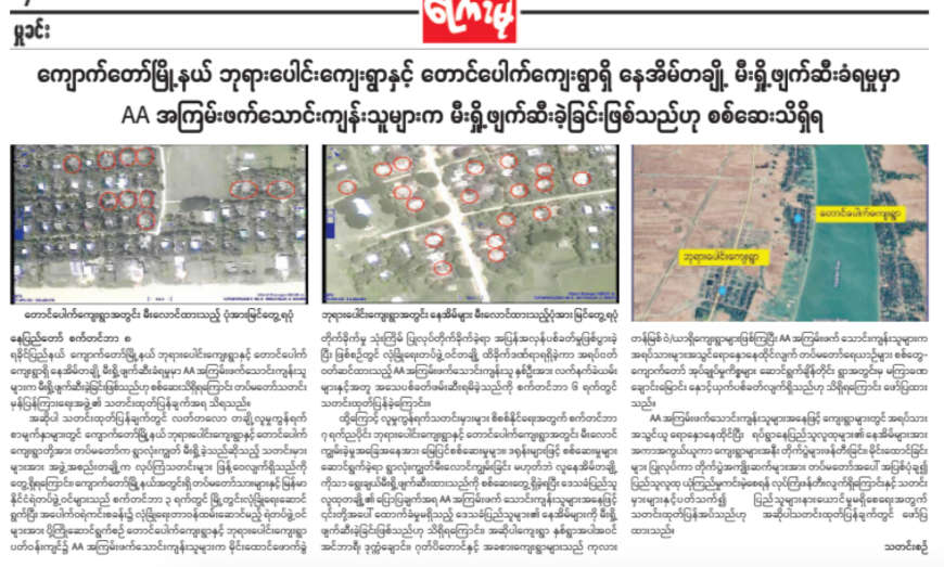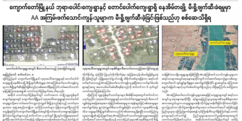 ၎င်းအပြင် “ လူမှုကွန်ရက် သတင်းမှားများအား စိစစ်နိုင်ရေးအတွက် စက်တင်ဘာ ၇ ရက်နေ့ ညပိုင်း ဘုရားပေါင်းနှင့် တောင်ပေါက်ကျေးရွာအတွင်း မီးလောင်ကျွမ်းခဲ့မှုအခြေအနေအား မြေပြင်စစ်ဆေးမှုများ၊ ဒရုန်းများဖြင့် စစ်ဆေးမှုများ ဆောင်ရွက်ခဲ့ရာ ရွာလုံးကျွတ်မီးလောင်ကျွမ်းခြင်း မဟုတ်ဘဲ လူနေအိမ် တချို့ကိုသာ ရွေးချယ် မီးရှို့ဖျက်ဆီးထားသည်ကို စစ်ဆေးတွေ့ရှိခဲ့ရပြီး ဒေသခံပြည်သူလူတချို့၏ ပြောပြချက်အရ AA အနေဖြင့် ၄င်းတို့အပေါ်ထောက်ခံမှုမရှိသည့် ဒေသခံပြည်သူများ၏ နေအိမ်များကို မီးရှို့ဖျက်ဆီးခဲ့သည်ဟု သိရှိရကြောင်း” ဖော်ပြထားသည်။