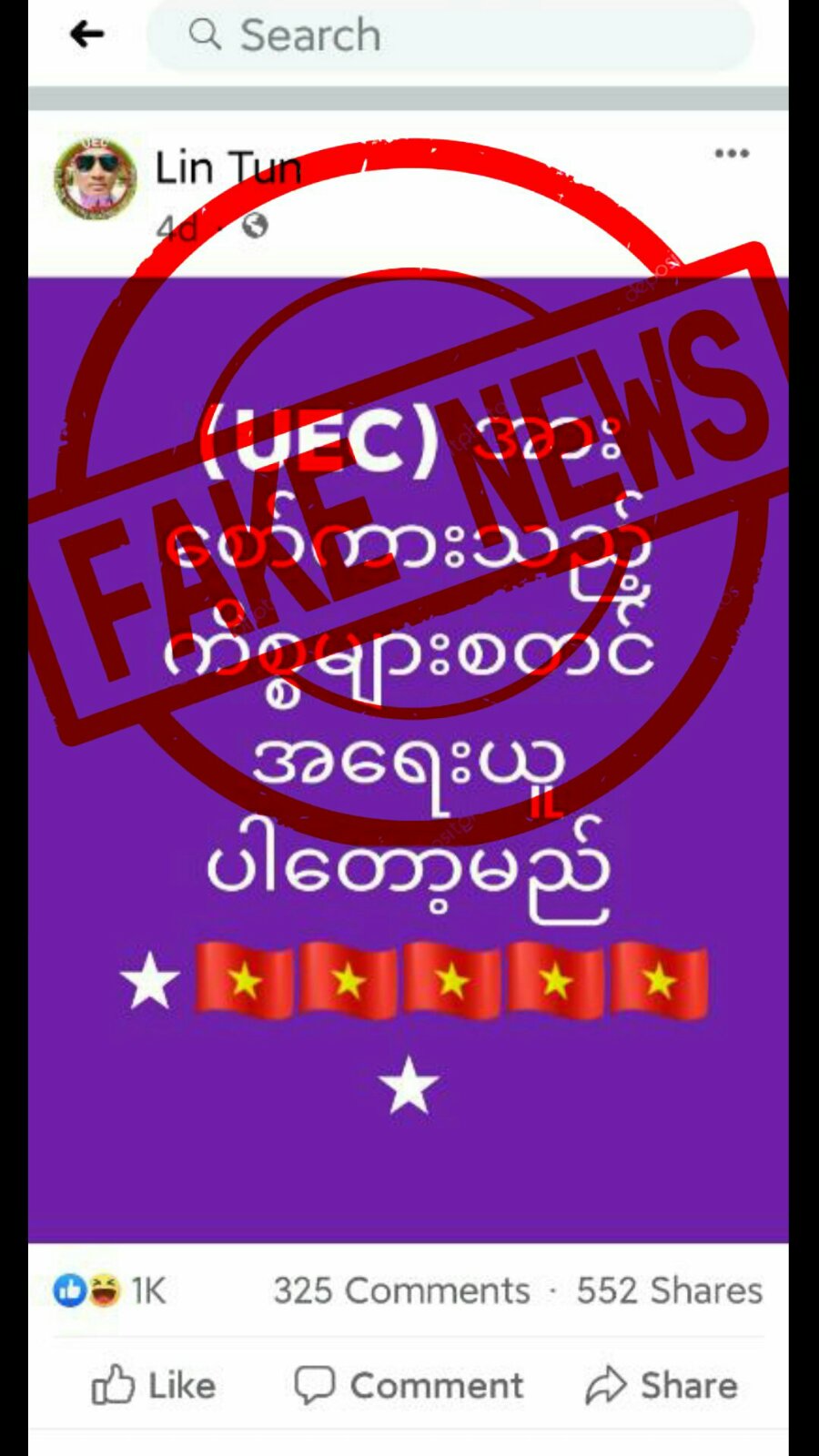 ပြည်ထောင်စုရွေးကောက်ပွဲကော်မရှင် (UEC) ကို ရွေးကောက်ပွဲနဲ့ပတ်သက်ပြီး စွပ်စွဲကန့်ကွက်မှုတွေရှိနေတဲ့အချိန်မှာ Lin Tun ဆိုတဲ့ FB အကောင့်ပိုင်ရှင်က “UEC အားစော်ကားသည့်ကိစ္စများ စတင်အရေးယူပါတော့မည်” ဆိုတဲ့ သတင်းအမှားကို နိုဝင်ဘာ ၁၇ ရက်က သူ့ရဲ့လူမှုကွန်ရက်စာမျက်နှာမှာ ဖော်ပြခဲ့ပါတယ်။