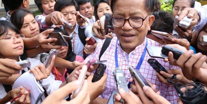 NUCC ၏ ကောင်စီဝင်များကို ၂၀၂၆ ခုနစ်၊ ဖေဖော်ဝါရီ ၃ ရက်နေ့က ပြုလုပ်သည့် NUCC ၏ သတင်းစာရှင်းလင်းပွဲ၌ တွေ့ရစဉ်။ (မောင်ခက်နွေ)