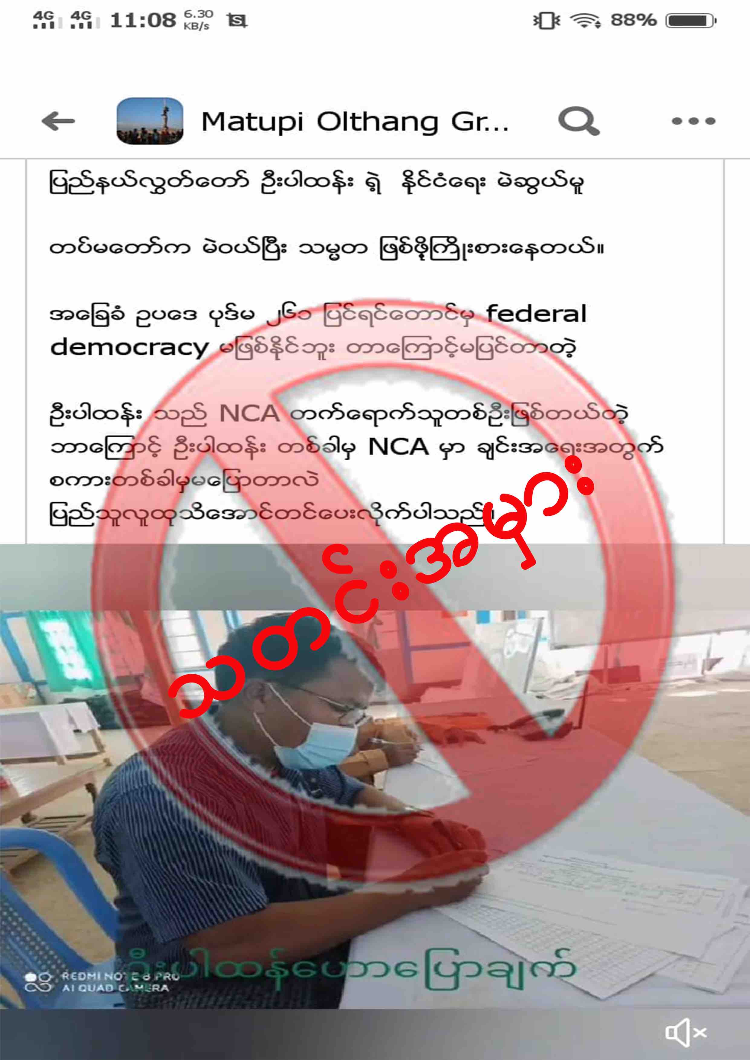 Matupi Olthang Group အဲဒီပိုစ်ဟာ ပြည်နယ်လွှတ်တော် ဦးပါထန်းရဲ့ နိုင်ငံရေးမဲဆွယ်မှုဆိုပြီး အစပြုထားပြီး အဲဒီအောက်မှာ ဆက်ရေးထားတာကတော့ တပ်မတော်က မဲဝယ်ပြီး သမ္မတဖြစ်ဖို့ကြိုးစားနေတယ်၊ အခြေခံဥပဒေ ပုဒ်မ ၂၆၁ ပြင်ရင်တောင်မှ Federal Democracy မဖြစ်နိုင်ဘူး ဒါကြောင့်မပြင်တာတဲ့" လို့ ဖော်ပြထားတာဖြစ်ပါတယ်။