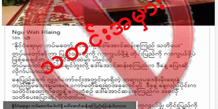 “နိုင်ငံရေးမှာ တပ်မတော်မပါဝင်ဖို့ ဒေါ်အောင်ဆန်းစုကြည်သတိပေး” ဆိုတဲ့ သတင်းအမှားတစ်ပုဒ်ဟာ ဒီဇင်ဘာလ ၂ ရက်နေ့က Ngu Wah Hlaing ဆိုတဲ့ အကောင့်ပိုင်ရှင်က ဒေါ်အောင်ဆန်းစုကြည်ဓာတ်ပုံနဲ့အတူ သူ့ရဲ့ လူမှုကွန်ယက်စာမျက်နှာမှာ ရေးသားဖော်ပြခဲ့ပါတယ်။