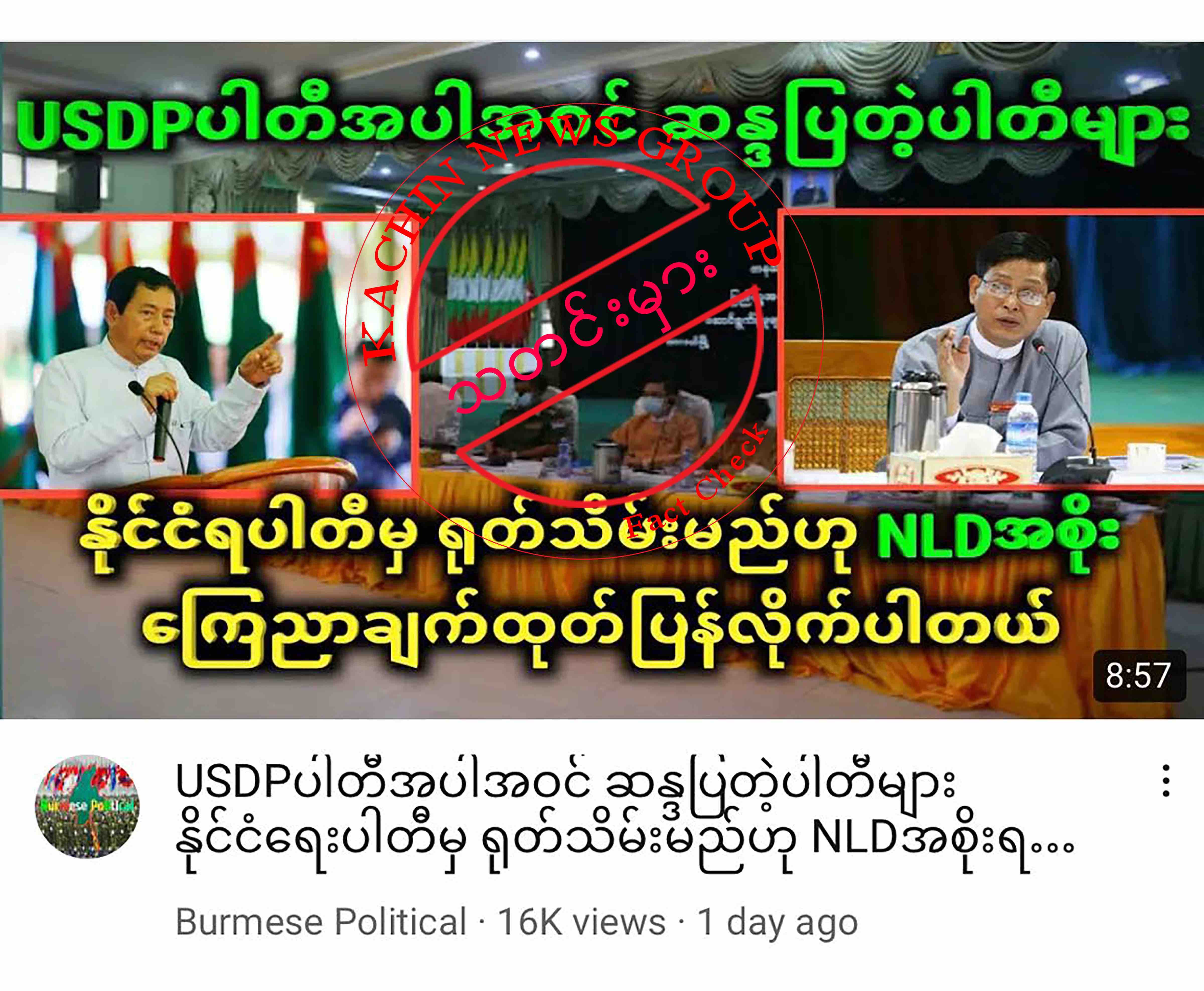၂၀၂၀ ပါတီစုံ အထွေထွေရွေးကောက်ပွဲကြီးကျင်းပခဲ့သည့် နောက်ဆက်တွဲအဖြစ် ရွေးကောက်ပွဲကို ပြန်လည်ကျင်ပပေးရန်အတွက် တောင်းဆိုသည့် ‘USDP ပါတီအပါအဝင် ဆန္ဒပြတဲ့ပါတီများကို နိုင်ငံရေးပါတီမှ ရုတ်သိမ်းမည်ဟု NLD အစိုးရကကြေညာထုတ်ပြန်လိုက်ကြောင်းအချက်အလက်မှားများပါဝင်နေသည့် ရုပ်သံတစ်ခုကို Burmese Political အမည်ရှိ Youtube Channel မှာ တင်ပြထားသည်ကို မြင်တွေ့ရသည်။