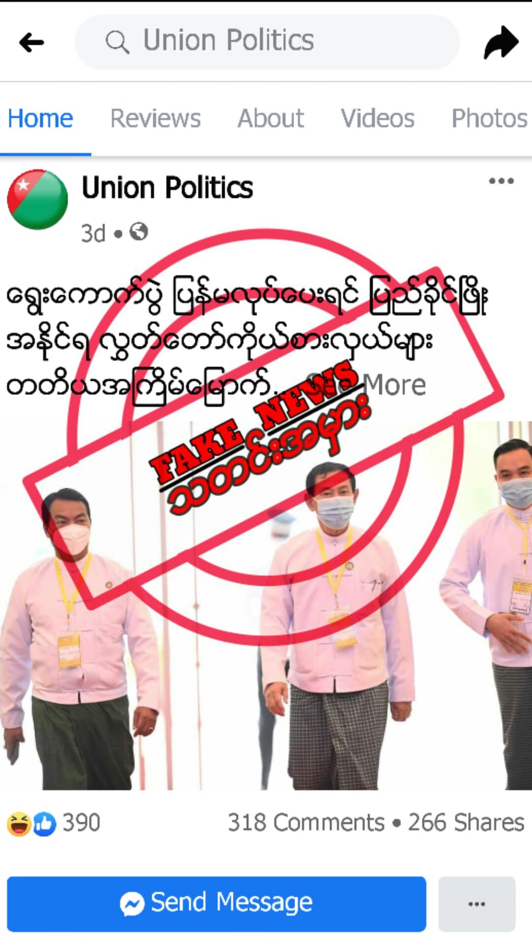 Union Politics ဆိုတဲ့ ပေ့ချ်မှာတင်ထားတာတွေကို လေ့လာကြည့်မယ်ဆိုရင် တပ်မတော်နဲ့ ပြည်ထောင်စုကြံ့ခိုင်ရေးနှင့် ဖွံ့ဖြိုးရေးပါတီကို အားပေးထောက်ခံတဲ့ ပေ့ချ်ဖြစ်တယ်ဆိုတာကို သိနိုင်ပါတယ်။ ရွေးကောက်ပွဲအပြီးမှာ ခုလို နိုင်ငံရေးနဲ့ ပတ်သက်တဲ့ သတင်းအချက်အလက်မှားတွေဆက်တိုက်ဆိုသလို ထွက်ပေါ်လာနေပါတယ်။