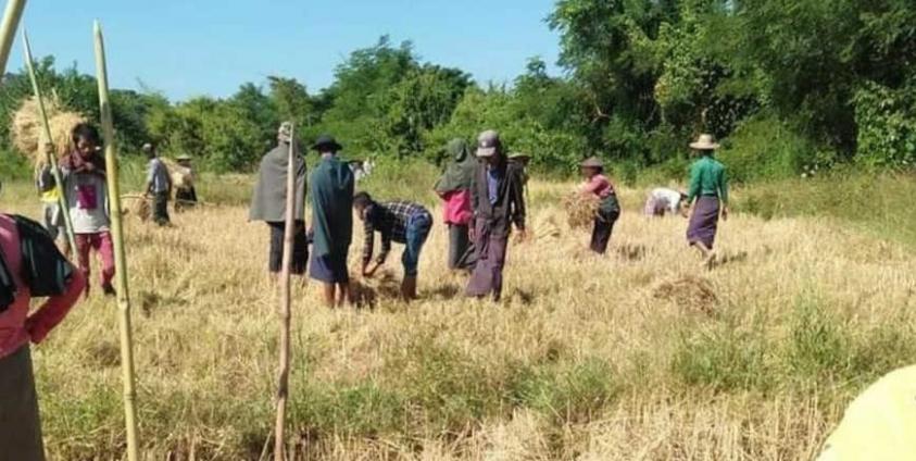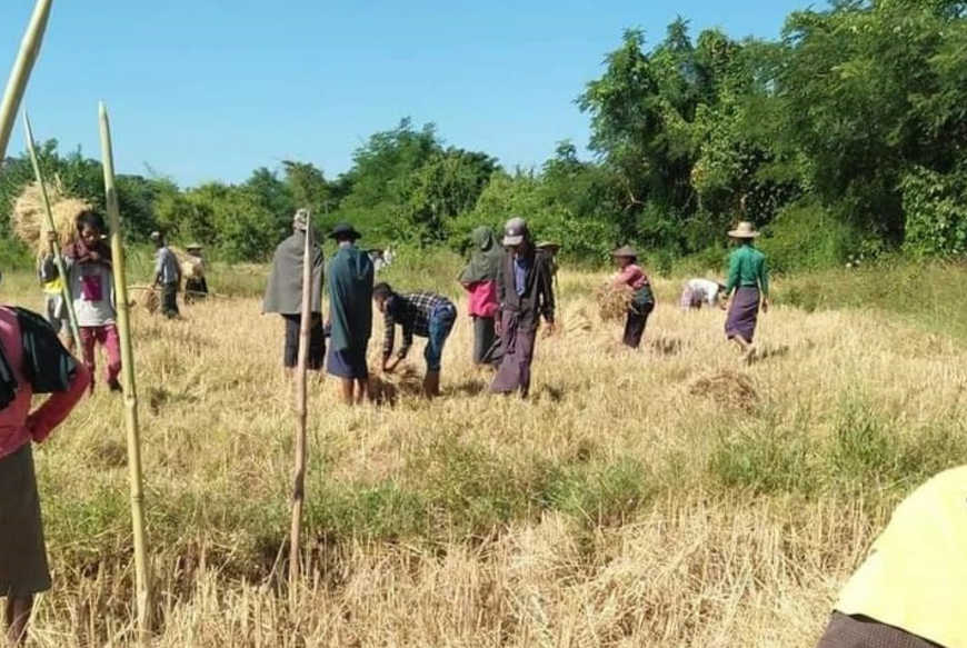 (ဓာတ်ပုံ- ကျောက်ဖြူမြို့နယ်မှ စစ်ဘေးရှောင်များရွာကို ပြန်ပြီးနောက် စုပေါင်းစပါးရိတ်နေကြစဉ်)