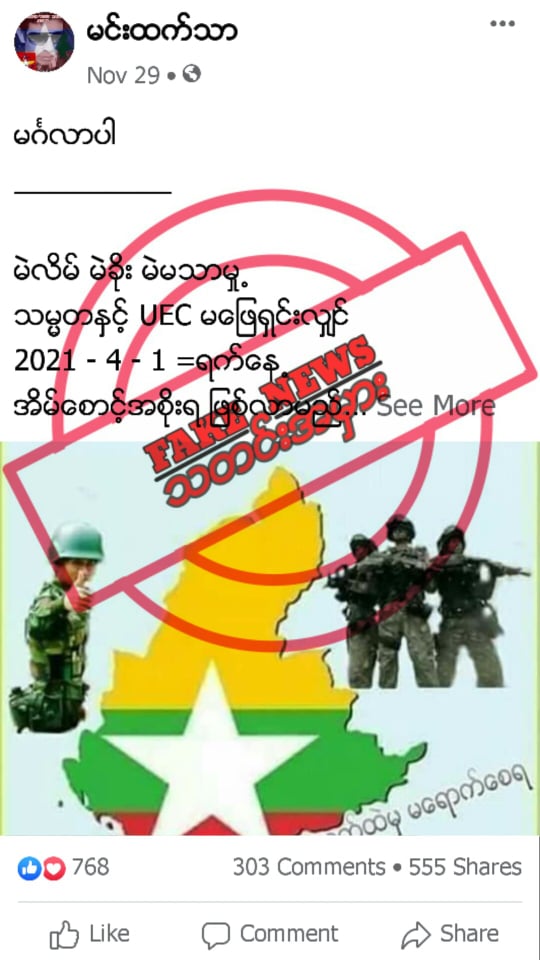 ၂၀၂၀ အထွေထွေရွေးကောက်ပွဲမှာ မြန်မာနိုင်ငံရွေးကောက်ပွဲကော်မရှင်နဲ့ အမျိုးသားဒီမိုကရေစီအဖွဲ့ချုပ်တို့ပေါင်းပြီး မဲလိမ်၊ မဲခိုးမှုတွေ ပြုလုပ်ခဲ့တယ်ဆိုတဲ့ သတင်းမှားတွေ ဆက်တိုက်တင်နေတဲ့ မင်းထက်သာဆိုတဲ့အကောင့်က မဲလိမ်၊ မဲခိုးမှုတေတွကို မဖြေရှင်းပေးရင် အိမ်စောင့်အစိုးရ ဖြစ်လာမယ်ဆိုတဲ့ သတင်းတု/သတင်းမှားတစ်ပုဒ် ဖြန့်ဝေခဲ့ပါတယ်။