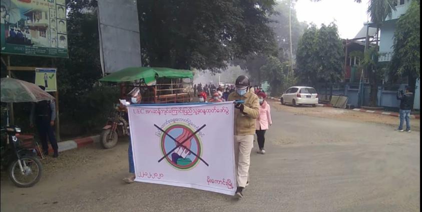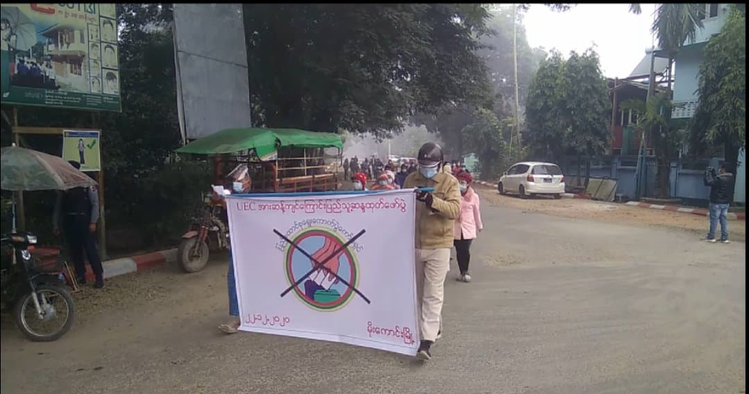 ပြည်ထောင်စုရွေးကောက်ပွဲကော်မရှင် (UEC) ၏လုပ်ဆောင်ချက်များ ကျေနပ်မူမရှိဟုဆိုကာ ဆန္ဒထုတ်ဖော်မှုတစ်ခု ကချင်ပြည်နယ်၊ မိုးကောင်းမြို့တွင် ဒီဇင်ဘာ ၂၂ ရက်က ပြုလုပ်ခဲ့ကြသည်။