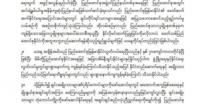 အဆိုပါ ထုတ်ပြန်ချက်ထဲတွင် မကြာမီဖွဲ့စည်းမည့် တတိယအကြိမ် ချင်းပြည်နယ်လွှတ်တော်သက်တမ်း အတွက် ချင်းပြည် နယ်အစိုးရအဖွဲ့ခေါင်းဆောင်ဝန်ကြီးချုပ် တာဝန်ပေးအပ်ရာ၌ ချင်းပြည်နယ်တစ်ဝှမ်းတရားမျှတမှုကို ဖော်ဆောင်နိုင်ပြီး ရေရှည်တည်တံ့သော ဖွဲ့ဖြိုးရေးအမြင်ရှိသူ၊ နယ်မြေအေးချမ်းလုံခြုံရေးနှင့် တရားဥပဒေစိုးမိုး ရေးကိုဖော်ဆောင်နိုင်ရေးအတွက် အရပ်ဘက်စစ်ဘက်ညှိနှိုင်းဆောင်ရွက်နိုင်သူ၊ ကိုယ်ကျိုးစီးပွားကို ဖက်တွယ် ခြင်းမပြုဘဲ အမျိုးသားအကျိုးစီးပွားအကျိုးပြုစိတ်ဓါတ်ဖြင့် မည်သည့်အဖွဲ့အစည်းနှင့်မဆို အပြုသဘောဆောင် ဆက်ဆံနိုင်သူ၊ အစိုးရတာဝန်ထမ်းဆောင်စဉ်ကာလအတွင်း အမည်ပျက်သတင်း ထွက်ပေါ်ခြင်းမရှိသူ၊ ကျောသားရင်သားခွဲခြားခြင်းမရှိသူ စသည်များဖြင့် ကိုက်ညီသည့် ပြည်သူ့ကိုယ်စားလှယ်ကိုသာ ရွေးချယ်တာဝန်ပေး အပ်နိုင်ပါရန်တောင်ဆိုအပ်ပါကြောင်း ဖော်ပြထားသည်။