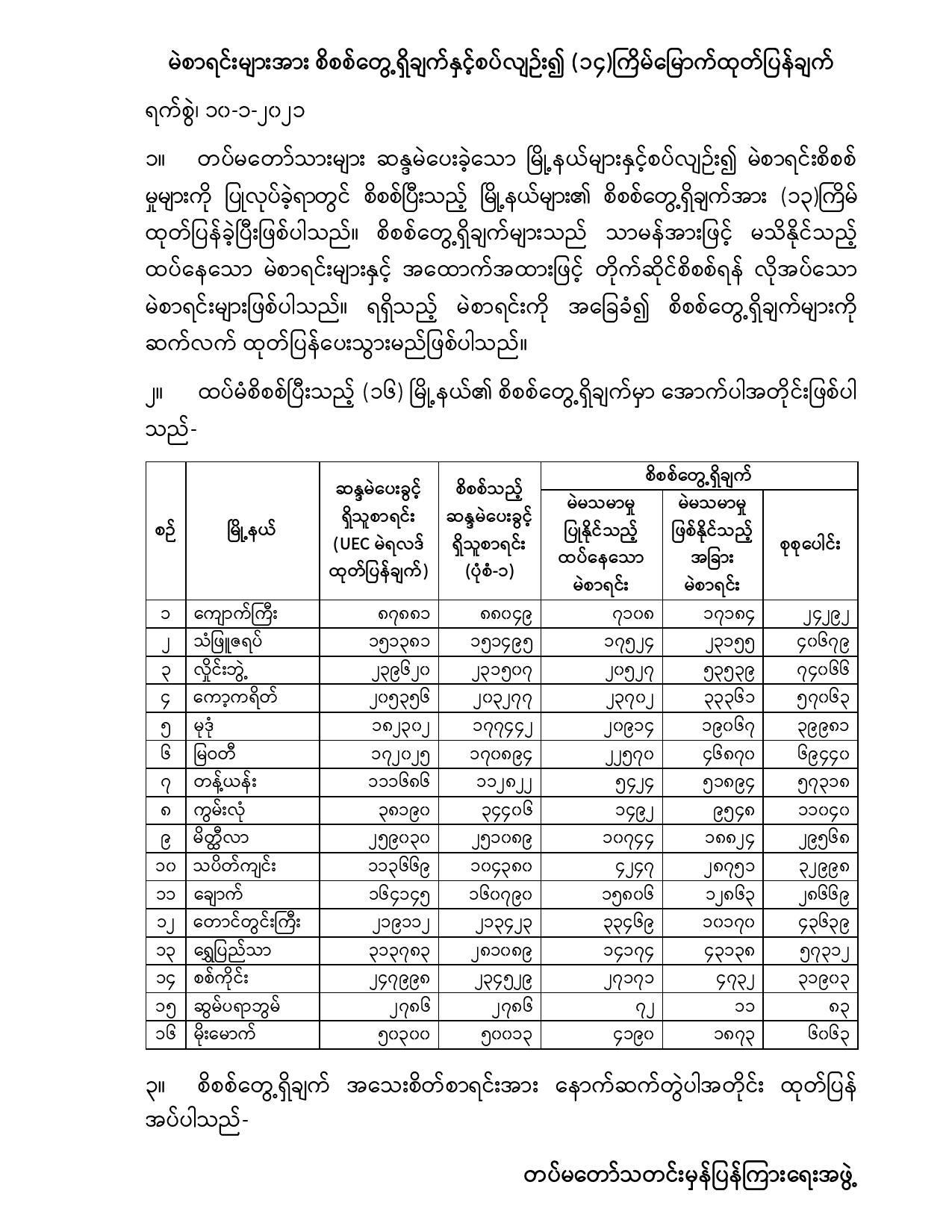 ထုတ်ပြန်ချက်အရ သံတောင်ကြီးမြို့နယ်တွင် ဆိုင်ရာရွေးကောက်ပွဲကော်မရှင် ထုတ်ပြန်ချက်အရ မဲဆန္ဒရှင် ၆၂,၂၈၉ ဦးရှိပြီး စိစစ်ရာတွင် မဲဆန္ဒရှင် ၆၁,၀၆၅ ဦးရှိကြောင်း၊ မဲစာရင်းထပ်နေမှုနှင့် အခြားမဲစာရင်းကွာဟမှု ၁၇,၀၆၇ ဦး ရှိကြောင်း ဖော်ပြထားသည်။