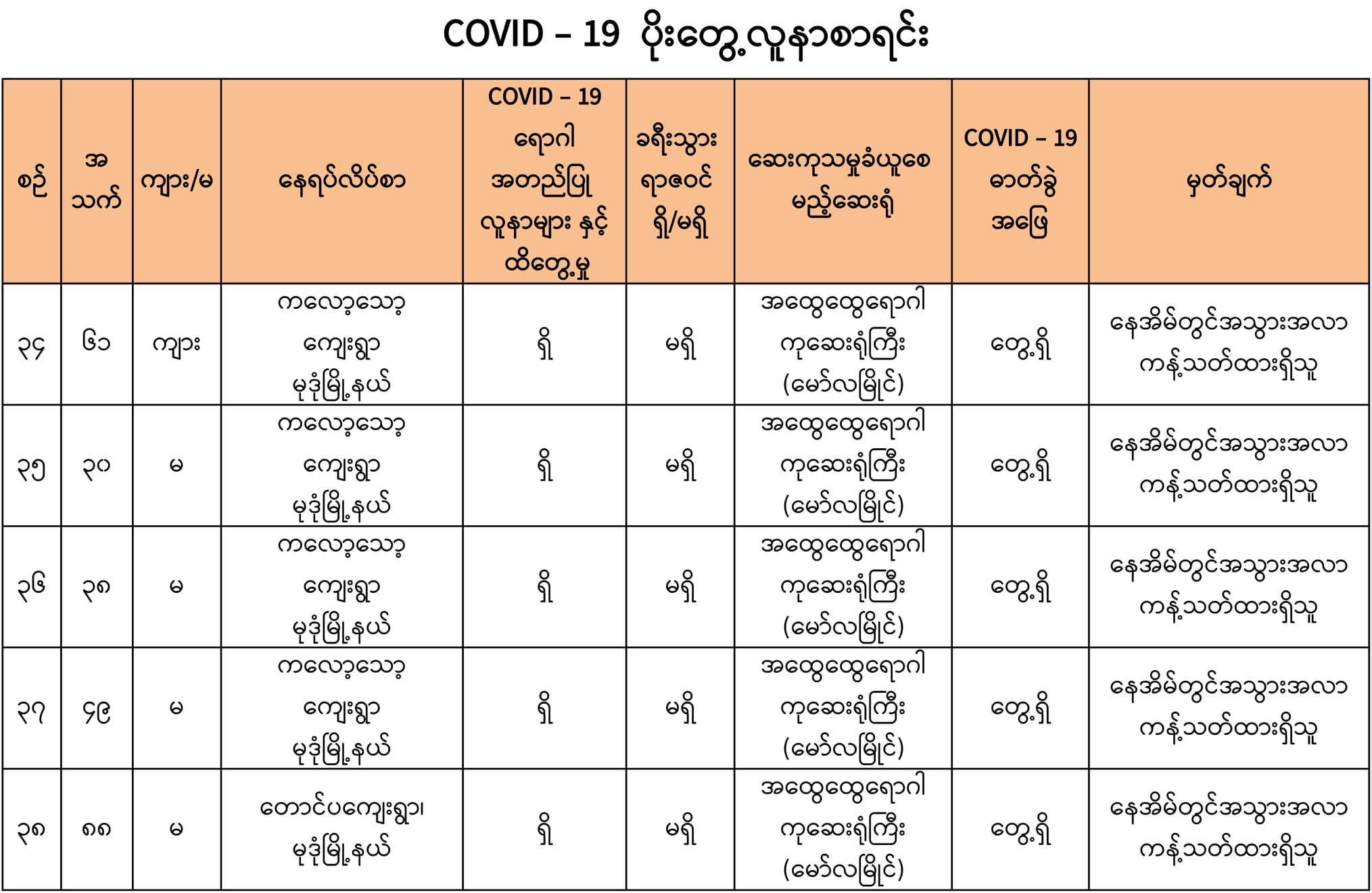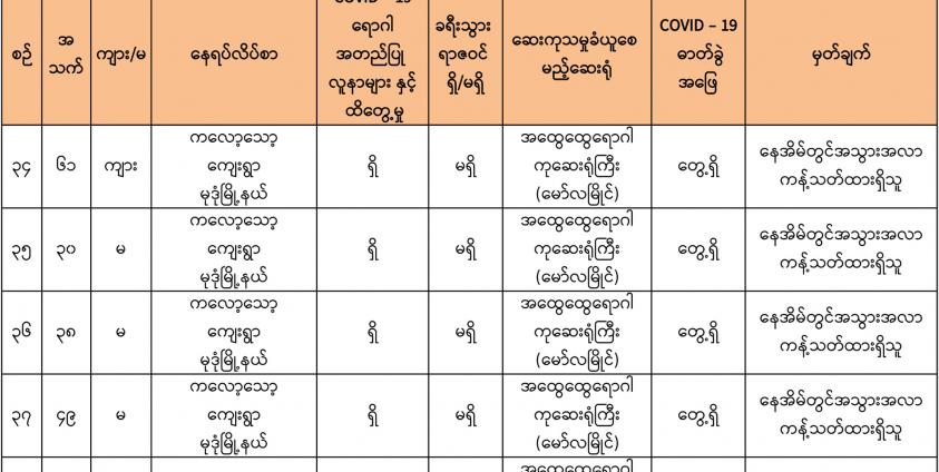 Covid 19 ရောဂါပိုးရှိသူ အမျိုးသမီးထံမှ ၎င်းတို့၏မိသားစုများကူးစက်ခဲ့ခြင်းဖြစ်ပြီး ကလော့သော့တိုက်နယ် တောင်ပကျေးရွာမှ အသက် ၈၈ နှစ်အရွယ် ပိုးတွေ့လူနာသည် ဆီးချိုရောဂါအခံရှိသူဖြစ်သောကြောင့် စိုးရိမ်ရဖွယ်ရှိကြောင်း ရွာခံ ဦးမြင့်စိုးက ပြောသည်။
