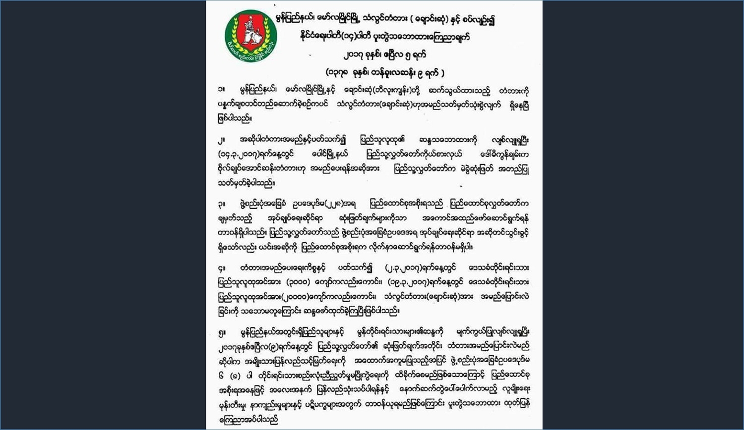အဆိုပါ ထုတ်ပြန်ချက်တွင် ဖွဲ့စည်းပုံအခြေခံဥပဒေပုဒ်မ(၂၂၈)အရ ပြည်ထောင်စုအစိုးရသည် ပြည်ထောင်စုလွှတ်တော်က ချမှတ်သည့် အုပ်ချုပ်ရေးဆိုင်ရာ ဆုံးဖြတ်ချက်များကိုသာ အကောင်အထည်ဖော်ဆောင်ရွက်ရန် တာဝန်ရှိပါသည်။ ပြည်သူ့လွှတ်တော်သည် ဖွဲ့စည်းပုံအခြေခံဥပဒေအရ အုပ်ချုပ်ရေးဆိုင်ရာ အဆိုတင်သွင်းခွင့်ရှိသော်လည်း ယင်းအဆိုကို ပြည်ထောင်စုအစိုးရက လိုက်နာဆောင်ရွက်ရန် တာဝန်မရှိပါဟုလည်း ပါ၀င်သည်။