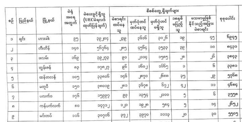 ယင်းအနက် မဲစာရင်းထပ်နေသူ ၁၇၂၃၊ မှန်ပုံတင်ထပ်နေသူ ၂၅၆၉၆၊ မှတ်ပုံတင်မရှိသူ ၁၆၉၆၆၊ ၁၈ နှစ်မပြည့်သူ ၁၉၄ ဦးနှင့် မသမာမှုဖြစ်နိုင်သည့် အခြားမဲစာရင်း ၁၇၇ ရှိသည်ဟုဖော်ပြထားသည်။