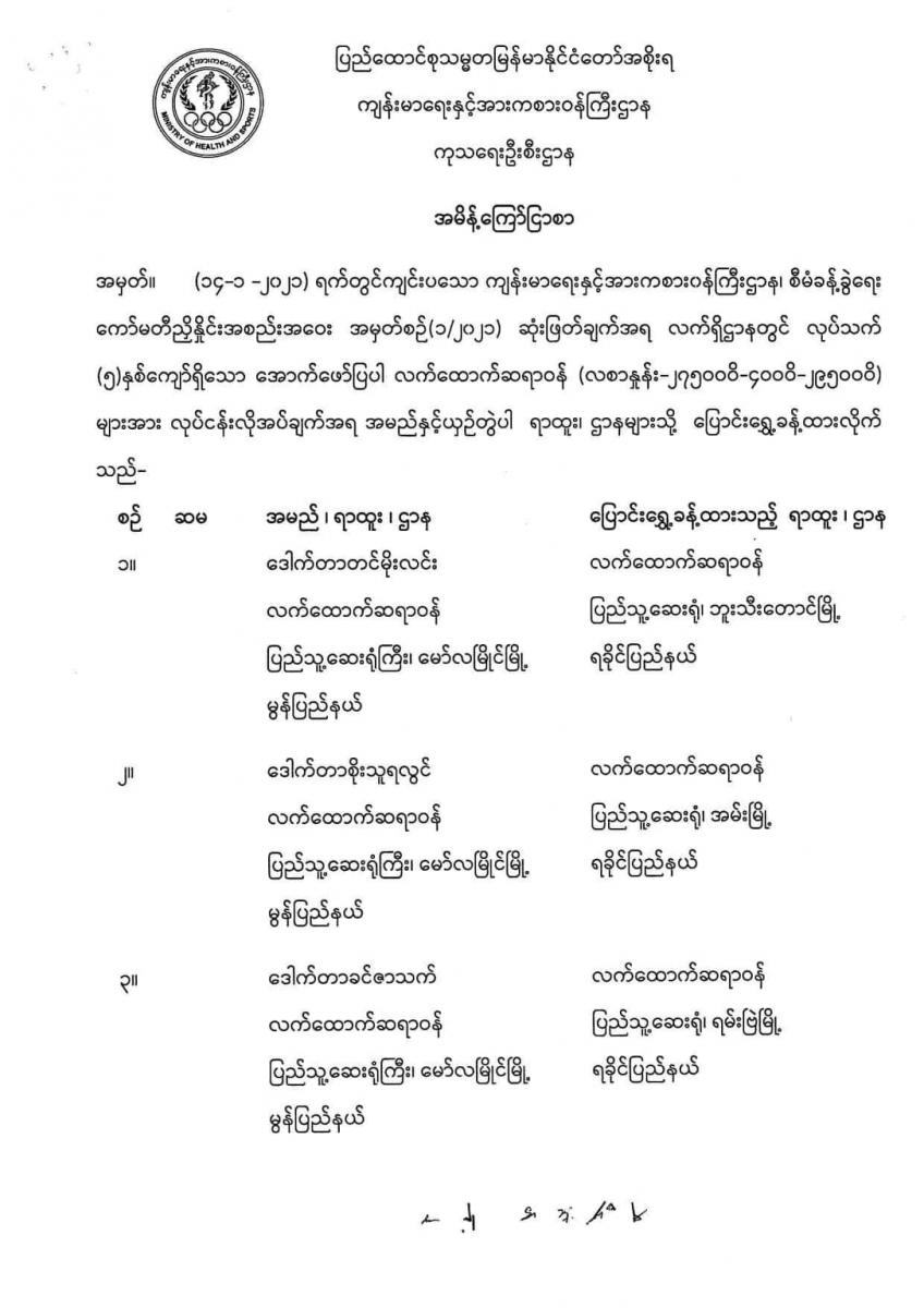 စိုင်းထွန်းစံ — ကျန်းမာရေးနှင့် အားကစားဝန်ကြီးဌာန စီမံခန့်ခွဲရေးကော်မတီ (၁၄-၁-၂၀၂၁) ညှိနှိုင်းအစည်းအဝေး (၁/၂၀၂၁) ဆုံးဖြတ်ချက်အရ မွန်ပြည်နယ်က လက်ထောက်ဆရာဝန် ၇ ဦးကို ရခိုင်ပြည်နယ်သို့ တာဝန်ထမ်းဆောင်ရန် ကျန်းမာရေးဝန်ကြီး ဒေါက်တာမြင့်ထွေး အမိန့်ကြေငြာစာထုတ်ပြန်၍ ပြောင်းရွေ့လိုက်ကြောင်း သတင်းရရှိသည်။