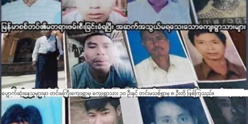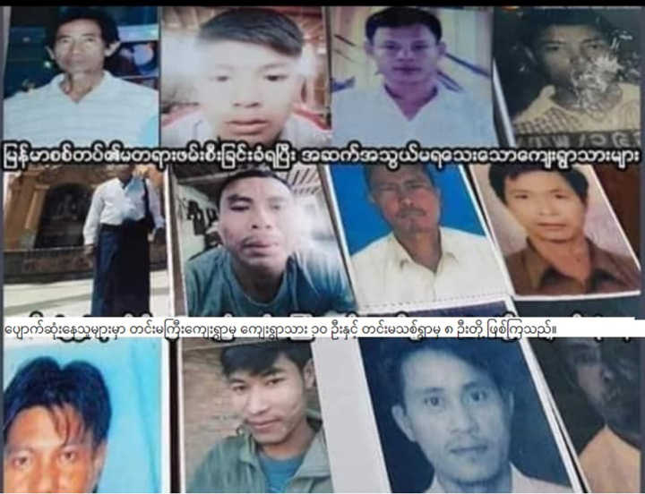တပ်က ဖမ်းပြီးနောက် ပျောက်ဆုံးနေသူ တင်းမကြီးကျေးရွာမှ ကျေးရွာသား ၁ဝ ဦးမှာ ဦးအောင်ညွန့် (၆၅) နှစ်၊ ဦးထွန်းဝင်းမောင် (၆၄) နှစ်၊ ဦးယာဉ်မောင် (၄ဝ) နှစ်၊ ဦးသန်းမောင်ထွန်း (၄ဝ) နှစ်၊ ဦးမောင်ဝင်း (ခေါ်) ဦးမောင်ဝင်းကြီး (၅ဝ) နှစ်၊ ဦးမောင်ဝင်းချေ (၃၇) နှစ်၊ ဦးမောင်ကြည်လင်း (၄ဝ) နှစ်၊ ဦးမောင်စိန်ဝင်း အသက် ၅ဝ ကျော်၊ မောင်ထွန်းထွန်းဝေ (၁၅) နှစ်နှင့် မောင်နေလင်းဦး (၂၈) နှစ်တို့ဖြစ်ကြောင်း၊ မတ်လ ၁၃ ရက်နေ့က တင်းမရွာသစ်မှ ဖမ်းဆီးခေါ်ဆောင်ခံရပြီး ပျောက်ဆုံးနေသူ သူ ၈ ဦးမှာ ဦးမောင်စိတ်ကြီး၊ ဦးကျော်ဝင်း၊ ဦးလှကျော်ကြီး၊ ဦးမောင်သန်းစိုး၊ ဦးစောရွှေသန်း၊ ဦးစံသာမောင်၊ ဦးမောင်မြအေးနှင့် ဦးမောင်ထွန်းစိန်တို့ ဖြစ်ကြောင်း မိသားစုများက ပြောကြားသည်။