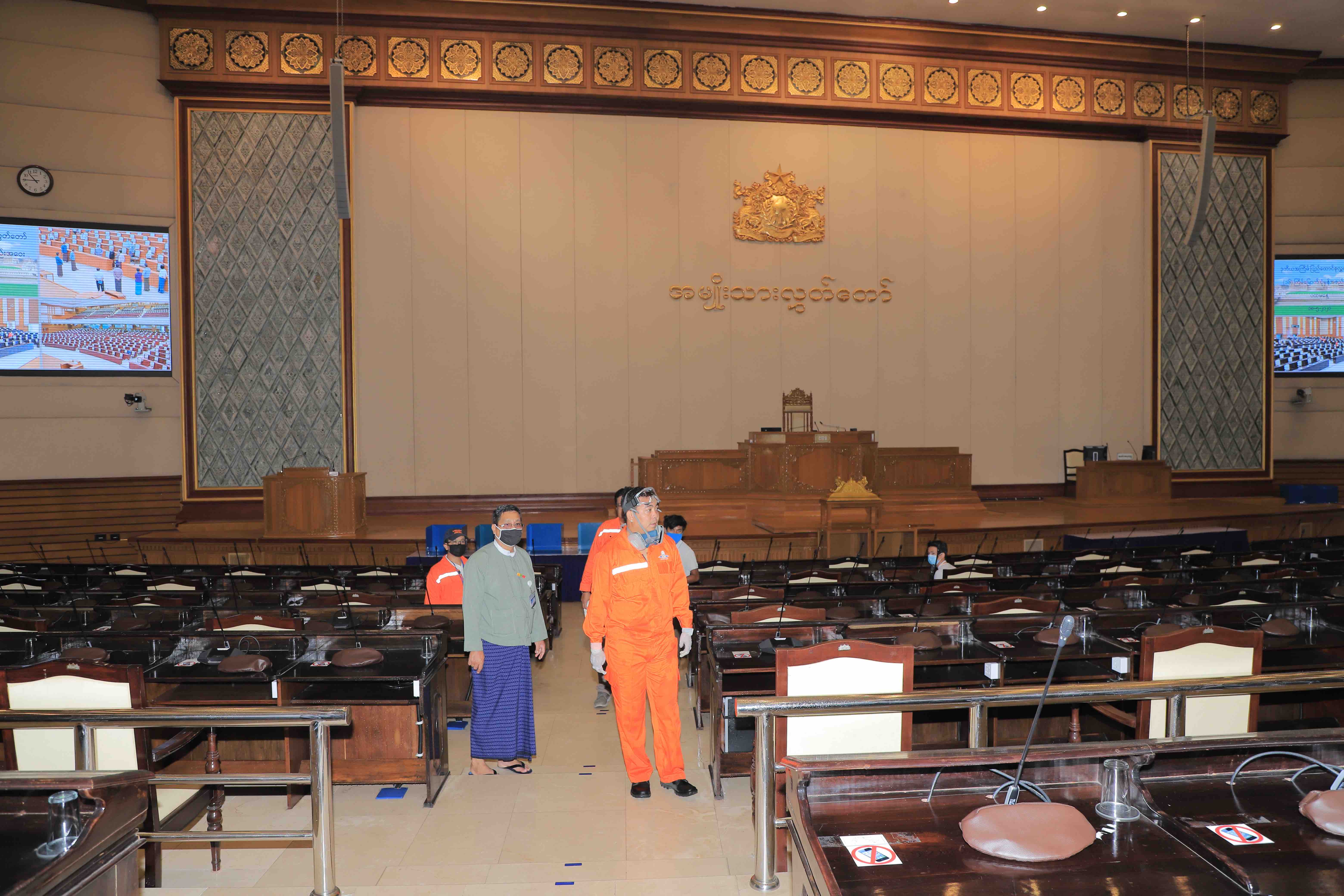 ပုံစာ - ကိုဗစ်ကာလအတွင်းက အမျိုးသားလွှတ်တော် အဆောက်အအုံတွင် ပိုးသတ်ဆေးဖျန်းရန် လုပ်ဆောင်နေမှု မြင်ကွင်း။ ဓာတ်ပုံ - အမျိုးသားလွှတ်တော်