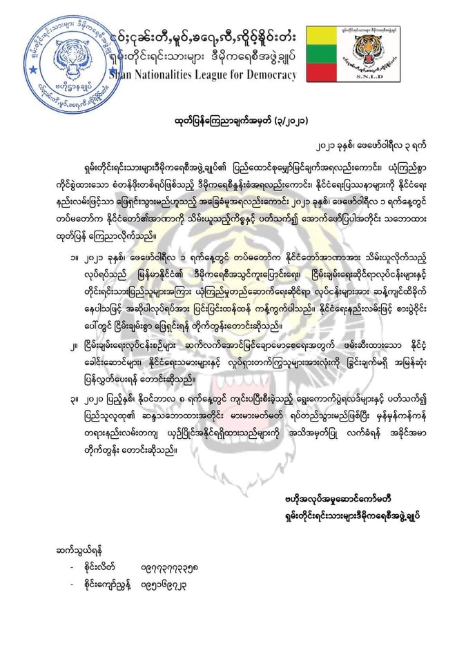 အာဏသိမ်းခြင်းအပေါ် ပြင်းပြင်းထန်ထန်ကန့်ကွက်ကြောင်းနှင့် ဖမ်းဆီးထားသော နိုင်ငံ့ခေါင်းဆောင်များ အမြန်ဆုံးပြန်လွှတ်ရန် SNLD ပါတီ သဘောထားထုတ်ပြန်တောင်းဆို