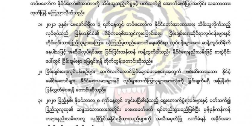 တပ်မတော်က နိုင်ငံတော်အာဏာကို သိမ်းယူလိုက်သည့်လုပ်ရပ်သည် မြန်မာနိုင်ငံ၏ ဒီမိုကရေစီအသွင်ကူးပြောင်းရေး၊ ပြိမ်ချမ်းရေးဆိုင်ရာလုပ်ငန်းများနှင့် တိုင်းရင်းသာပြည်သူများအကြား ယုံပြည်မှုတည်ဆောက်ရေးဆိုင်ရာ လုပ်ငန်းများအား ဆန့်ကျင်ထိခိုက်နေပါသဖြင့် အဆိုပါလုပ်ရပ်အား ပြင်းပြင်းထန်ထန် ကန့်ကွက်ကြောင်းနှင့်  နိုင်ငံရေးနည်းလမ်းဖြင့် စားပွဲဝိုင်းပေါ်တွင် ငြိမ်းချမ်းစွာ ဖြေရှင်းရန် တိုက်တွန်းကြောင်း တောင်းဆိုထားသည်။