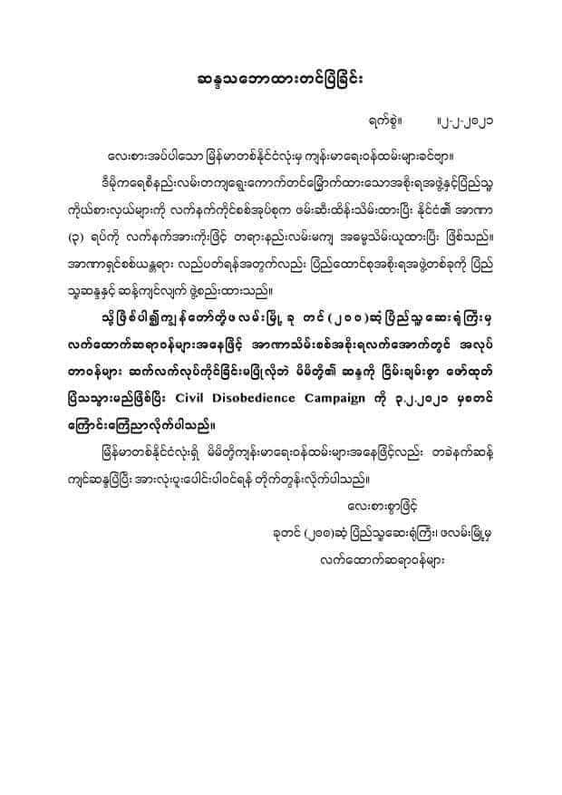 မြန်မာနိုင်ငံ တစ်နိုင်ငံလုံး မြို့နယ်တော်တော်များများတွင် လက်ထောက်ဆရာဝန်များ အနေဖြင့် အာဏာသိမ်းစစ်အစိုးရ လက်အောက်တွင် အလုပ်ဆက်လက်လုပ်ကိုင်လိုခြင်း မပြုလိုတော့ကြောင်း ဖေဖော်ဝါရီလ ၂ ရက်နေ့တွင် ဆန္ဒသဘောထား ထုတ်ပြန်ခဲ့ကြသည်။