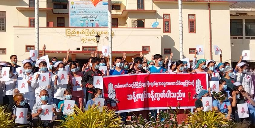 ယနေ့ ညနေ ၃နာရီအချိန်ခန့် လွိုင်ကော်ပြည်သူ့ဆေးရုံကြီးဝန်းထဲမှာ ကျန်းမာရေးဝန်ထမ်းများက တပ်မတော်သည် ပြည်သူ့အစိုးရထံမှ အဓမ္မအာဏာသိမ်းယူခြင်းကို ဆန့်ကျင်ကန့်ကွက်တဲ့ ဖဲကြိုးနီလုပ်ရှားမှုကမ်ပိန်းကို ပြုလုပ်ခဲ့ပါတယ်။