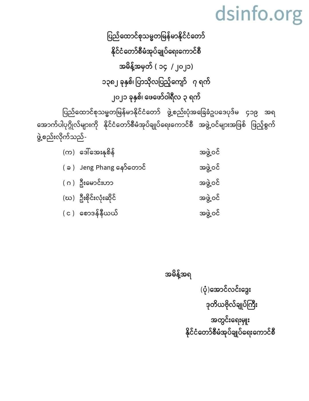 တပ်မတော်မှအသစ်ဖွဲ့စည်းလိုက်သည့် နိုင်ငံတော်စီမံအုပ်ချုပ်ရေးကောင်စီတွင် တပ်မတော်ကာကွယ်ရေးဦးစီးချုပ် ဗိုလ်ချုပ်မှူးကြီးမင်းအောင်လှိုင်က ဥက္ကဌရာထူးရယူထားပြီး ဖေဖော်ဝါရီ ၃ ရက် ယမန်နေ့ညပိုင်းတွင် အဖွဲ့ဝင်များ ဖြည့်စွက်ဖွဲ့စည်းလိုက်သည့်စာရင်းတွင် ဒေါ်အေးနုစိန်၊ Jeng Phang နော်တောင်၊ ဦးမောင်းဟာ၊ ဦးစိုင်းလုံးဆိုင်၊ စောဒန်နီယယ်တို့ ပါဝင်လာခြင်းဖြစ်သည်။