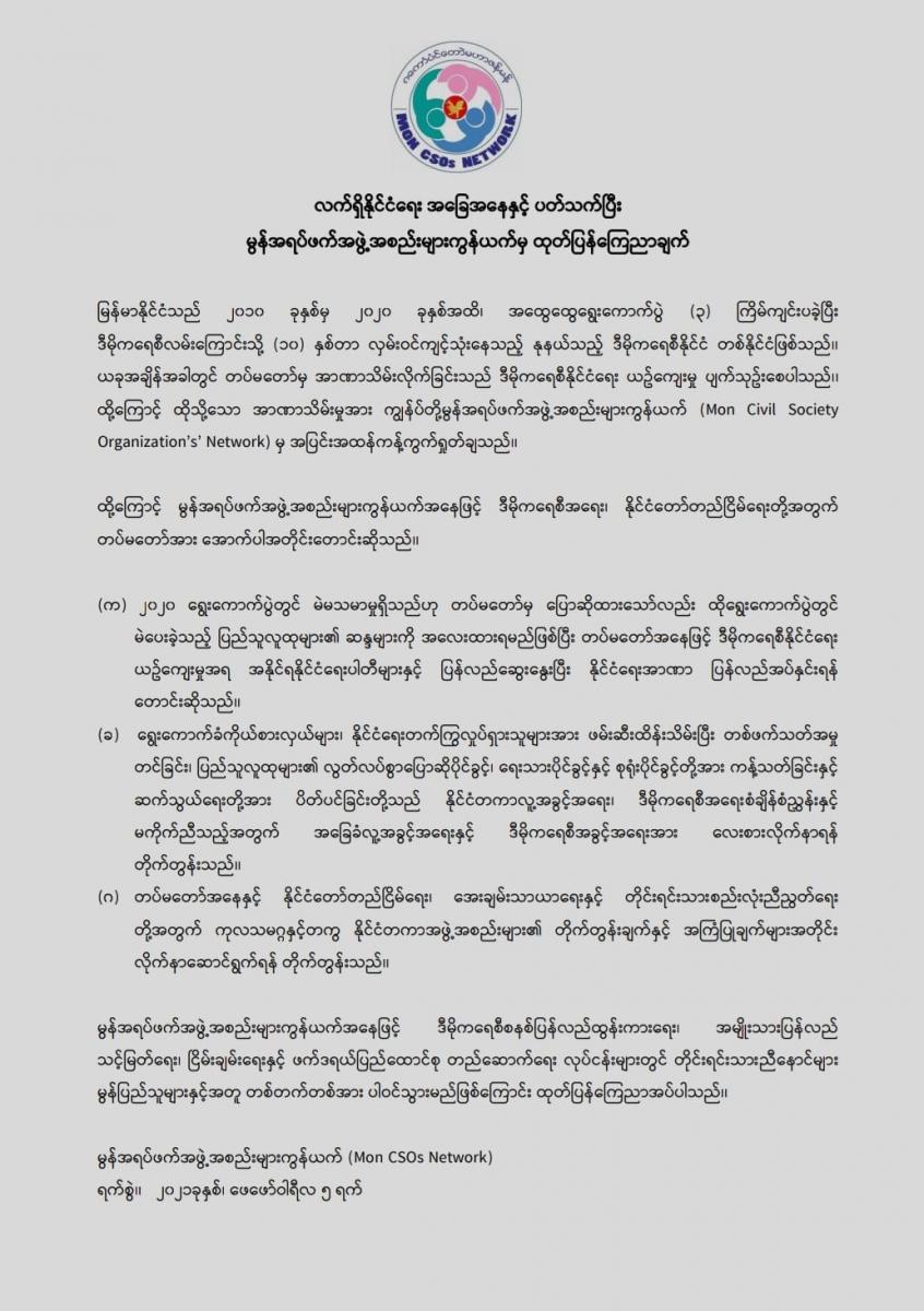 တပ်မတော်မှအာဏာသိမ်းလိုက်ခြင်းသည် ဒီမိုကရေစီနိုင်ငံရေး ယဉ်ကျေးမှုပျက်သုဉ်းစေသောကြောင့် မွန်အရပ်ဖက်အဖွဲ့အစည်းများကွန်ယက် Mon Civil Society Organization’s Network မှ အပြင်းအထန်ကန့်ကွက်ရှုတ်ချကြောင်း ဖေဖော်ဝါရီ ၅ ရက်နေ့စွဲဖြင့် ကြေညာချက်တစ်စောင်ထုတ်ပြန်သည်။