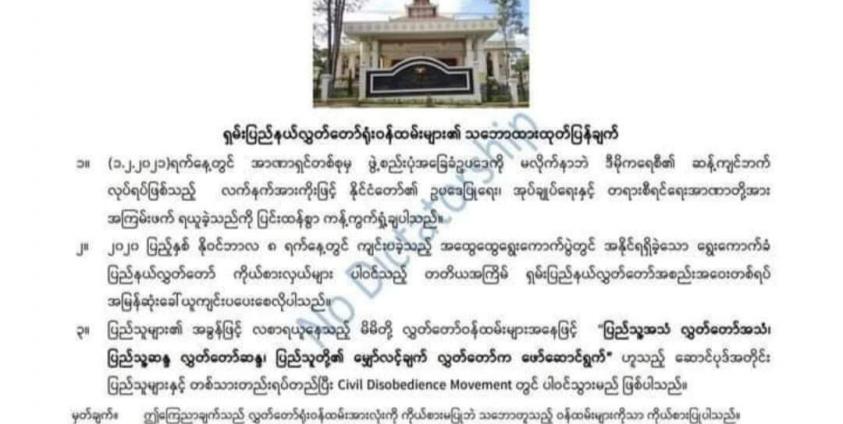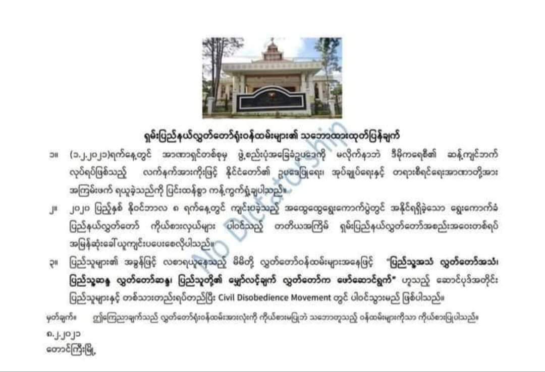 ပြည်သူများ၏အခွန်ဖြင့် လစာယူနေသည့် လွှတ်တော်ဝန်ထမ်းများအနေဖြင့် ပြည်သူ့အသံ လွှတ်တော်အသံ၊ ပြည်သူ့ဆန္ဒ လွှတ်တော်ဆန္ဒ၊ ပြည်သူတို့၏မျှော်လင့်ချက် လွှတ်တော်ကဖော်ဆောင်ရွက်ဟူသည့် ဆောင်ပုဒ်အတိုင်း ပြည်သူတို့နှင့် တစ်သားတည်းရပ်တည်ပြီး Civil Disobedience Movement တွင် ပါဝင်သွားမည်ဖြစ်ကြောင်း ရှမ်းပြည်နယ်လွှတ်တော် ရုံးဝန်ထမ်းများက ဖော်ဖော်ဝါရီ ၈ ရက်တွင် ထုတ်ပြန်ခဲ့သည်။