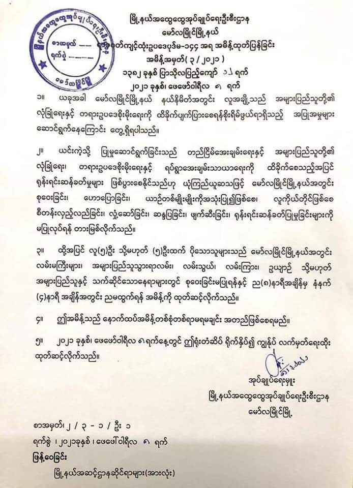 အလားတူ မော်လမြိုင်မြို့နယ်အတွင်း လူ ၅ ဦးမစုရနှင့် ညမထွက်ရအမိန့်ကို မြို့နယ်အုပ်ချုပ်ရေးမှူး လက်မှတ်ရေးထိုး ထုတ်ပြန်လိုက်ကြောင်း တွေ့ရှိရသည်။