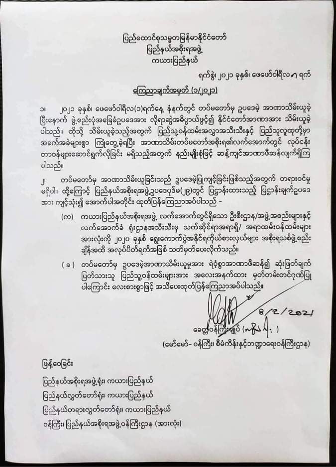 ယခုကဲ့သို့ တပ်မတော်မှ အာဏာသိမ်းယူတာဟာ ဥပဒေမဲ့ပြုကျင့်ခြင်းဖြစ်တာကြောင့်တရားဝင်မှုမရှိတဲ့ အတွက် ပြည်နယ်အစိုးရအဖွဲ့ ဥပဒေပုဒ်မ (၂၉)မှာ ပြဌာန်းထားတဲ့ ပြဌာန်းချက်ဥပဒေကို ကျင့်သုံးပြီးတော့ ကယားပြည် နယ်အစိုးရအဖွဲ့ လက်အောက်မှာရှိတဲ့ ဦးစီးဌာန၊ အဖွဲ့အစည်းတွေနဲ့ လက်အောက်ခံရုံးဌာနအသီးသီးမှ သက်ဆိုင်ရာအရာရှိ/ အရာထမ်းတွေကို ၂၀၂၀ ခုနှစ် ရွေးကောက်ပွဲအနိုင်ရ ကိုယ်စားလှယ်များ အစိုးရသစ်ဖွဲ့စည်းနိုင်တဲ့အချိန်အထိ အလုပ်ပိတ်ရက်အဖြစ် သတ်မှတ်ပေးလိုက်တာ ဖြစ်ပါတယ်။